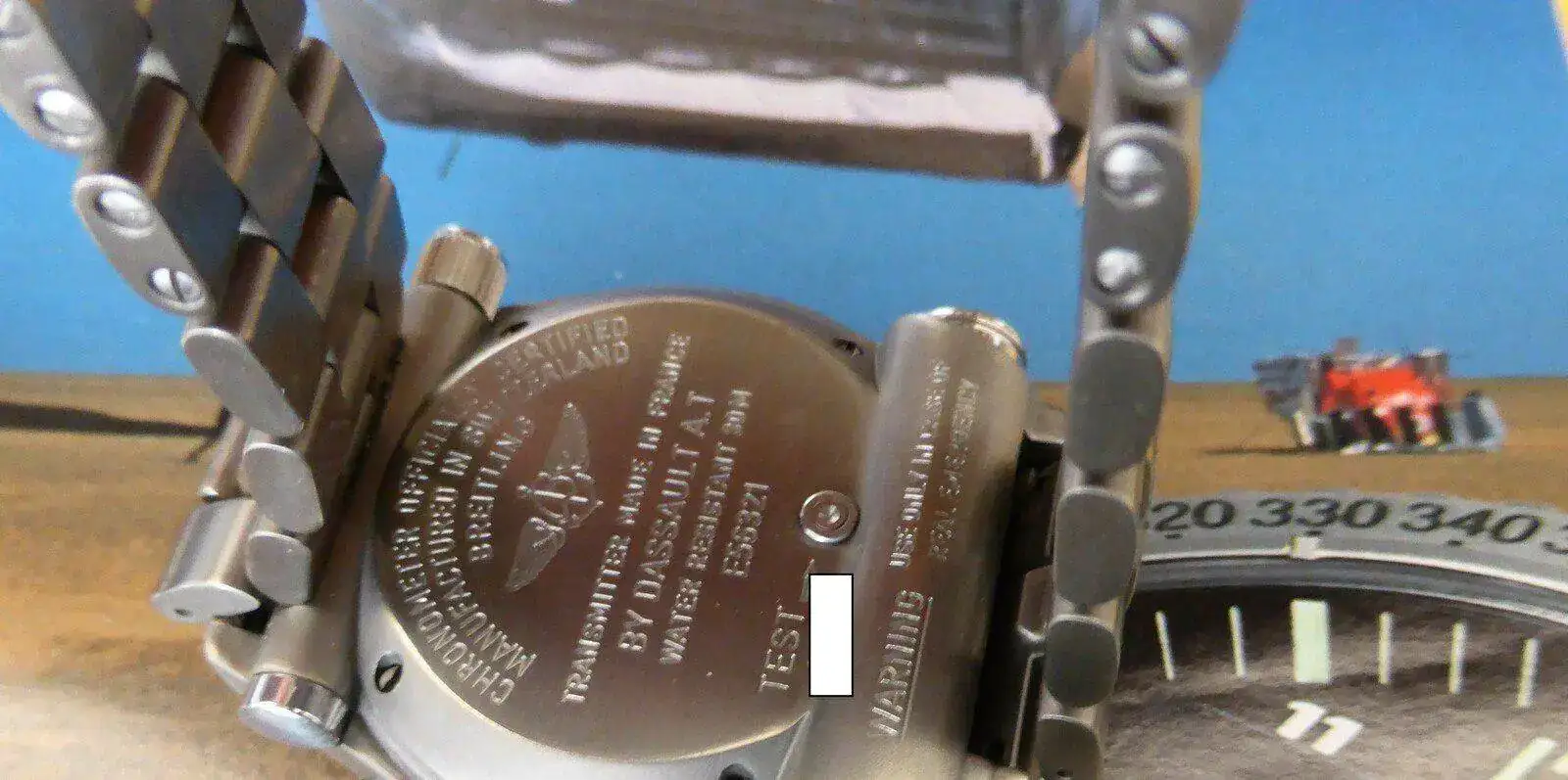 Remarcar que el reloj está IMPOLUTO sin mácula, incluso el cierre del armis está sin pelillos. todo es titanio, caja y armis, el armis es válido para tamaños XXL de muñeca, ya que compré dos eslabones extra en el CO oficial de Breitling que está en Palma de Mallorca.