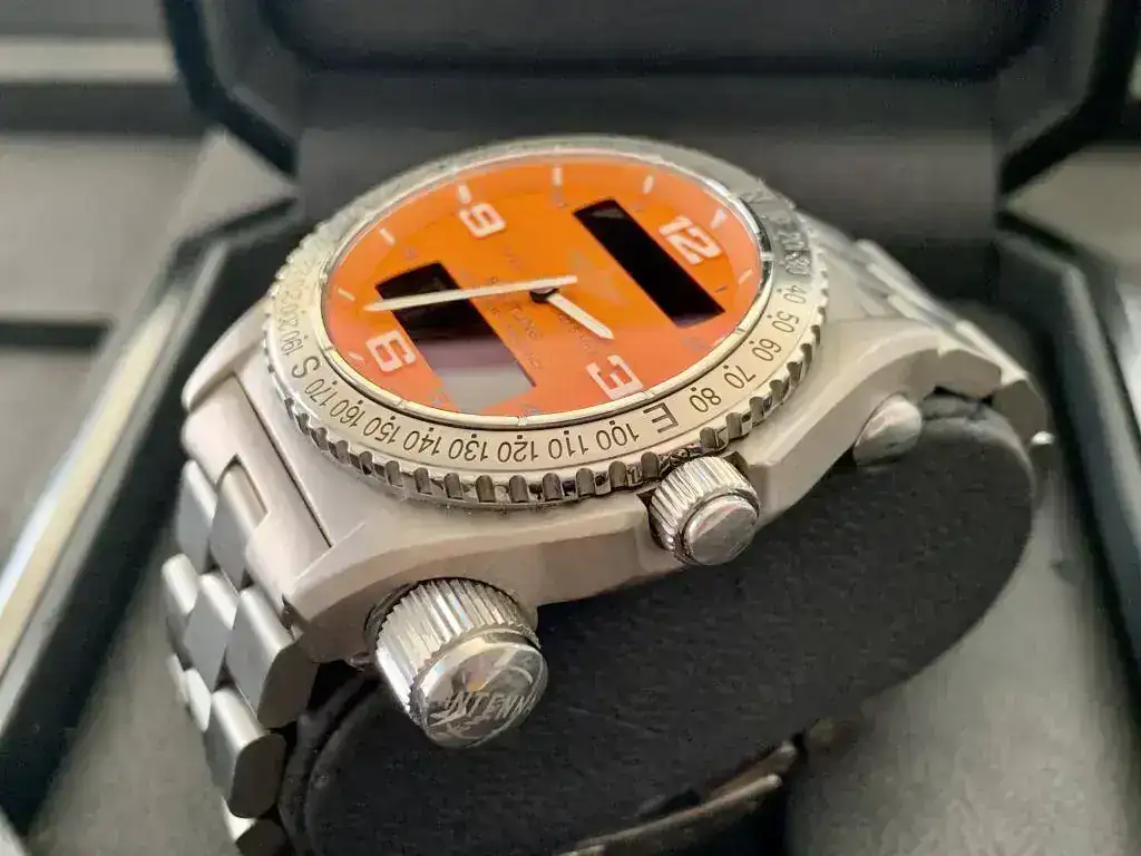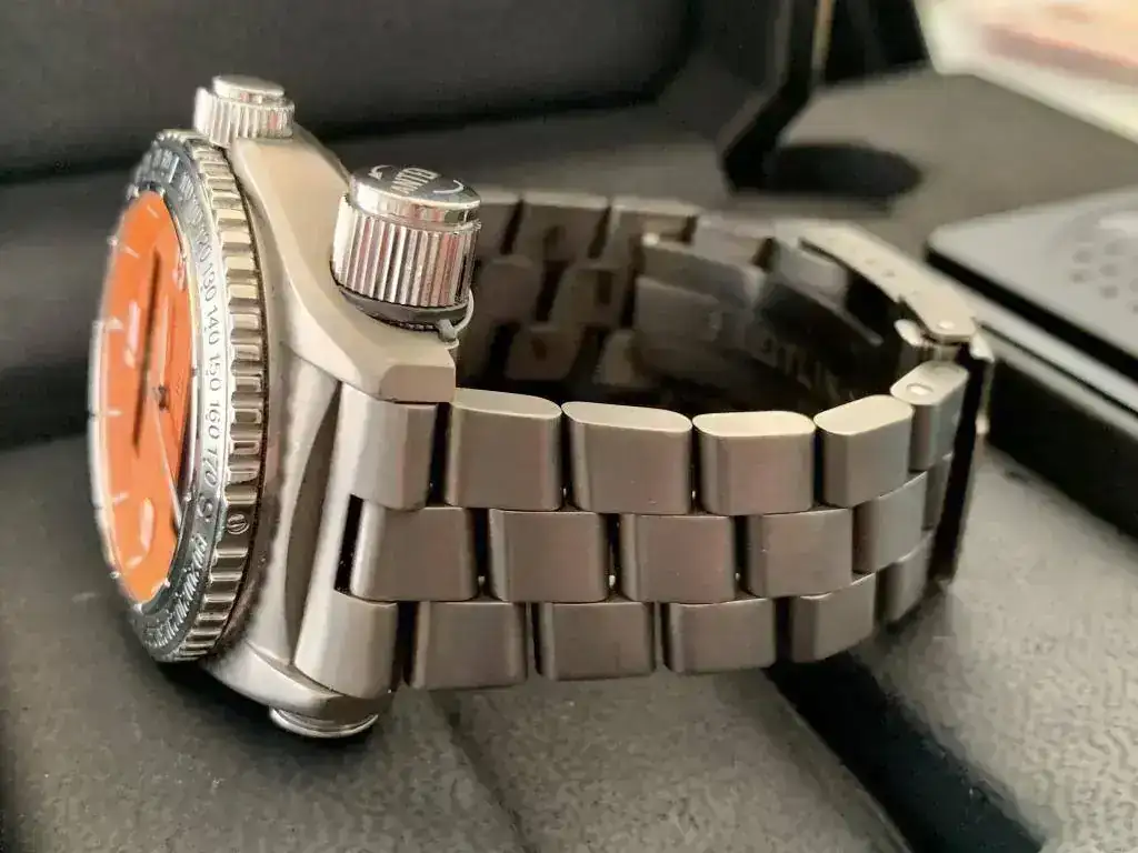 Inusual esfera naranja, movimiento de ultima generación Super-Quartz y brazalete con todos sus eslabones.
