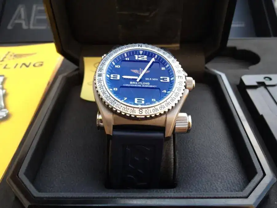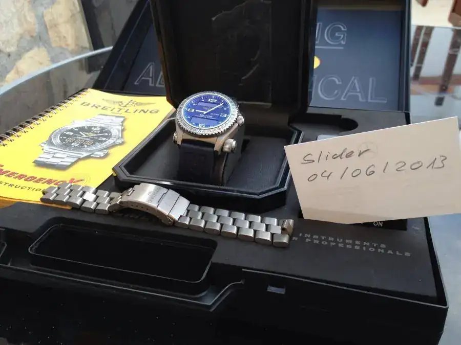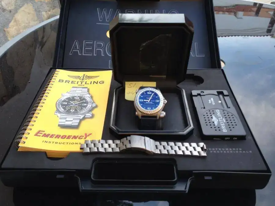Cambio este auténtico reloj-instrumento. Breitling Emergency titanio, con brazalete tambien en titanio y correa de caucho Diver pro azul le queda fenomenal, El reloj se entrega completo de todo, con su maletín, comprobador de baliza, manuales de uso, cosc, tarjeta de garantía y contratos en blanco para el cambio de nombre.