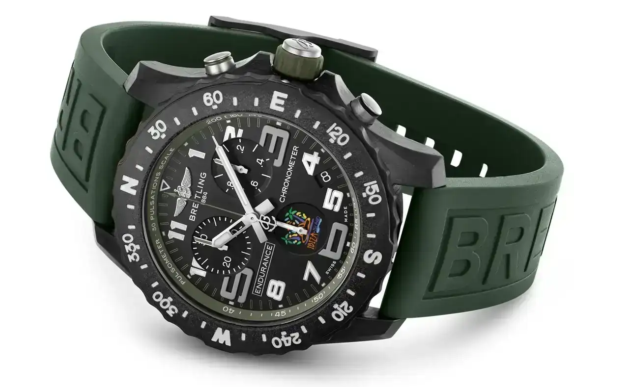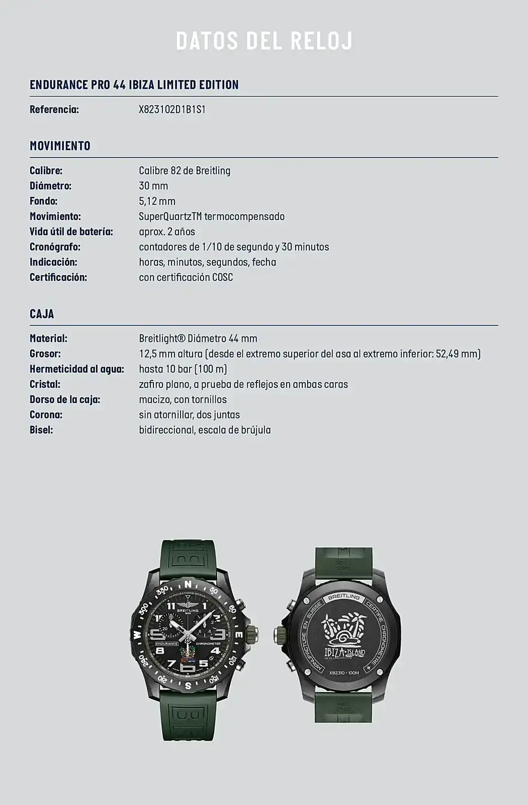 Monta un calibre Breitling 82, de cuarzo termocompensado y ultrapreciso. Solo va a haber 100 unidades, y lo mejor de todo es que todas lucirán la numeración 1/100, traducible como "uno de cien" o como lo que tú quieras contar sobre tu reloj del verano (nota: esto es lo que se dice en la nota de prensa, pero la verdad es que en las imágenes suministradas no se aprecia en ningún lado. Si compras uno pon foto).