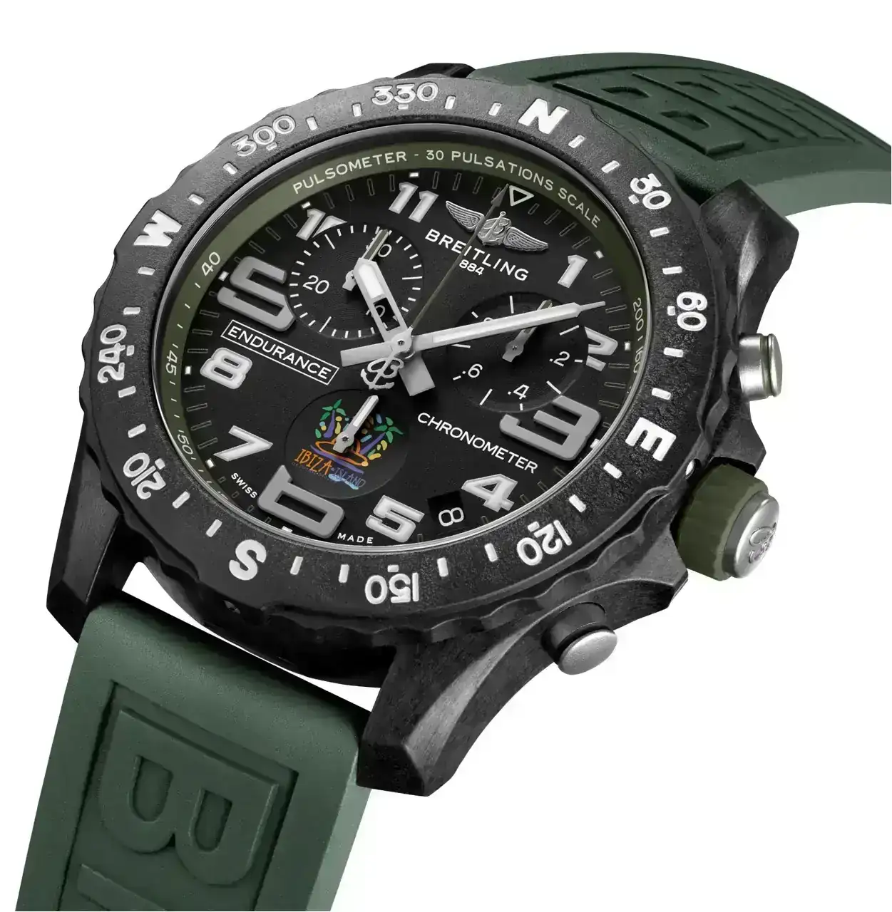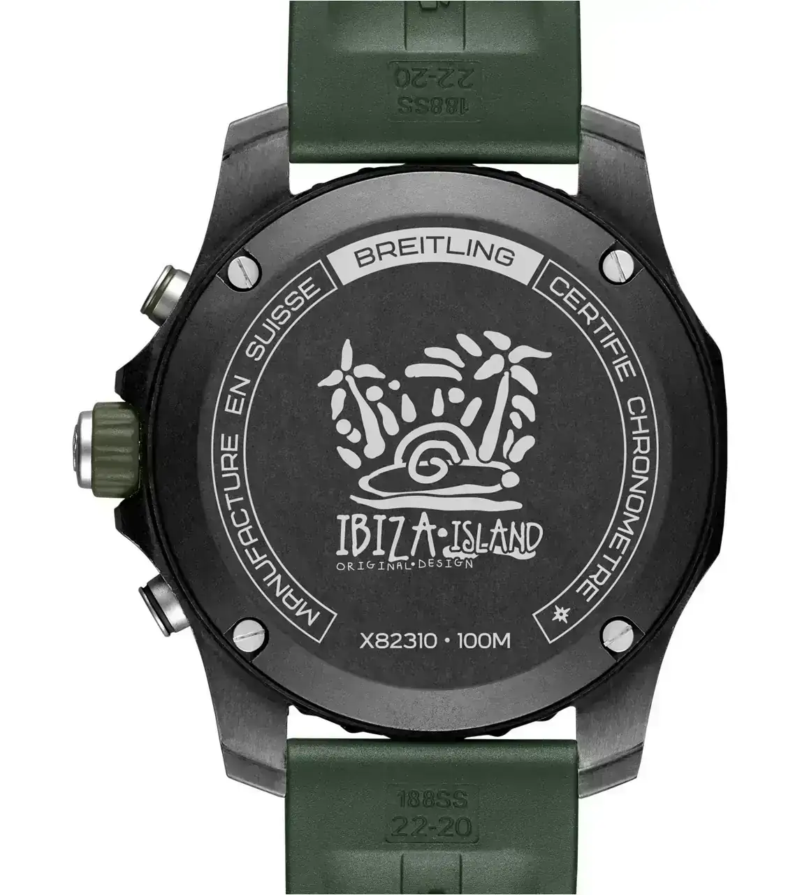 Todos sabrán que llevas un Endurance Pro Ibiza Limite Edition gracias al exclusivo color verde de su correa de caucho y el bisel interno. También porque la esfera, dentro del contador a las seis, luce el logo de Ibiza, un sol poniente entre palmeras. El mismo logo que podrá verse en la trasera en el supuesto de que te lo quites en algún momento.