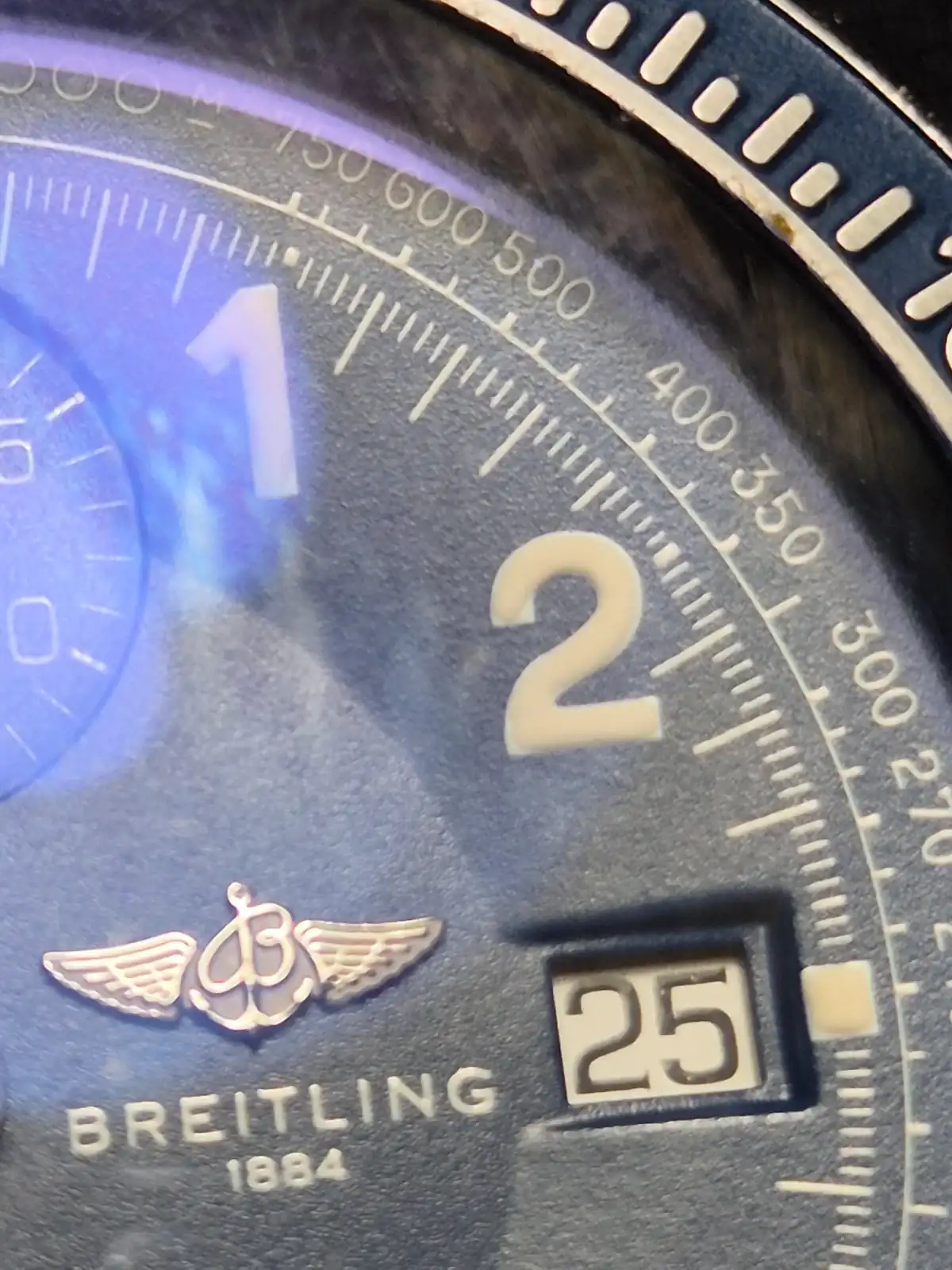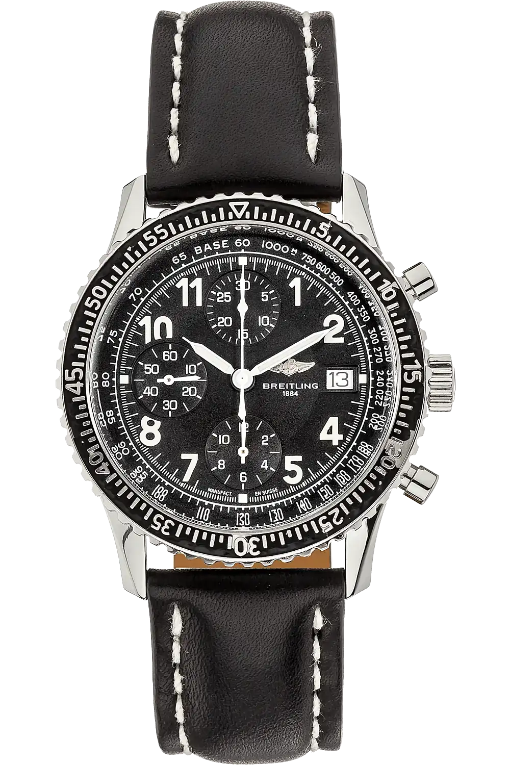 Un reloj que a mí me ha parecido precioso, el bisel presenta los números de escala de regla de minutos cincelados. Porta un mecanismo de base Valjoux 7750, denominado calibre Breitling 13, que es siempre garantía de fiabilidad.