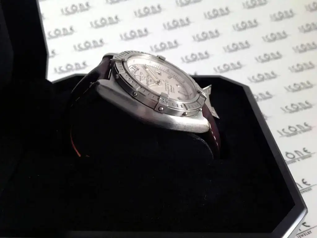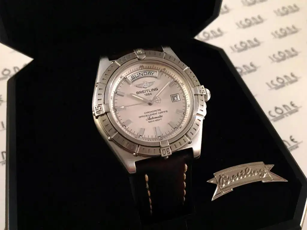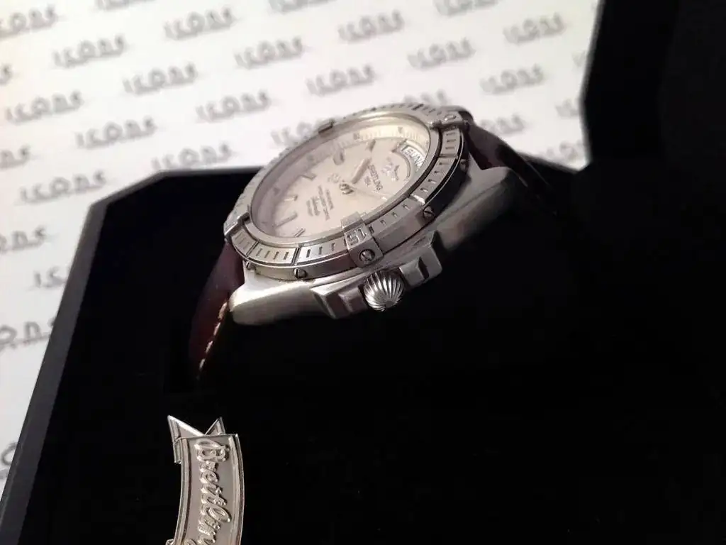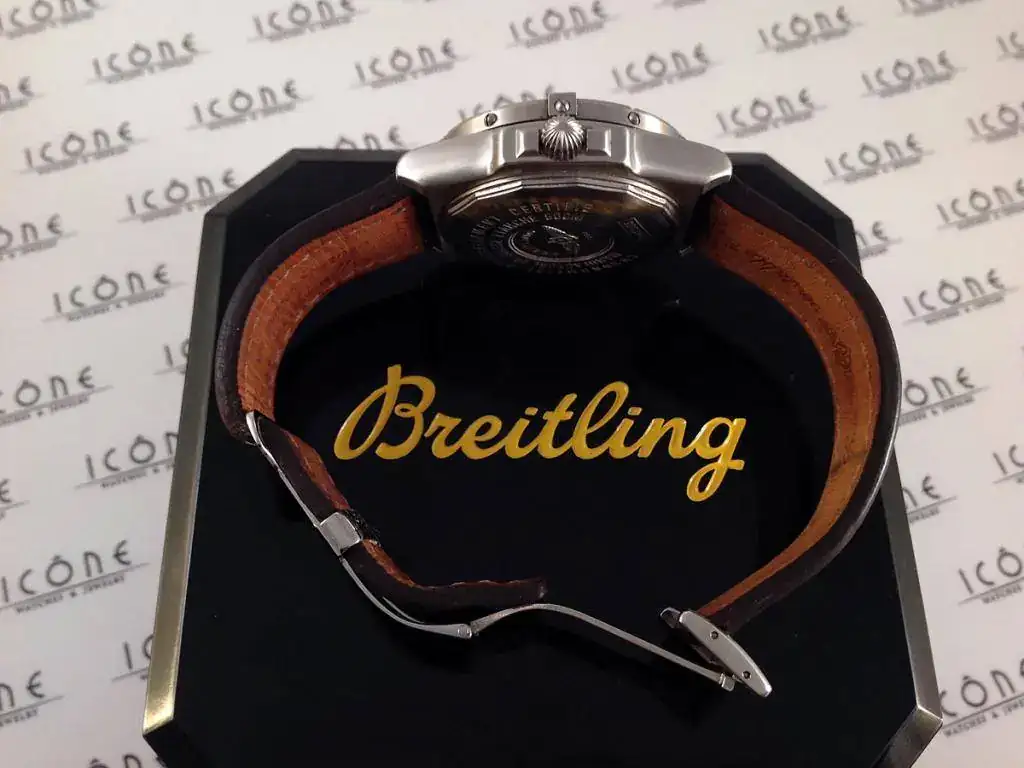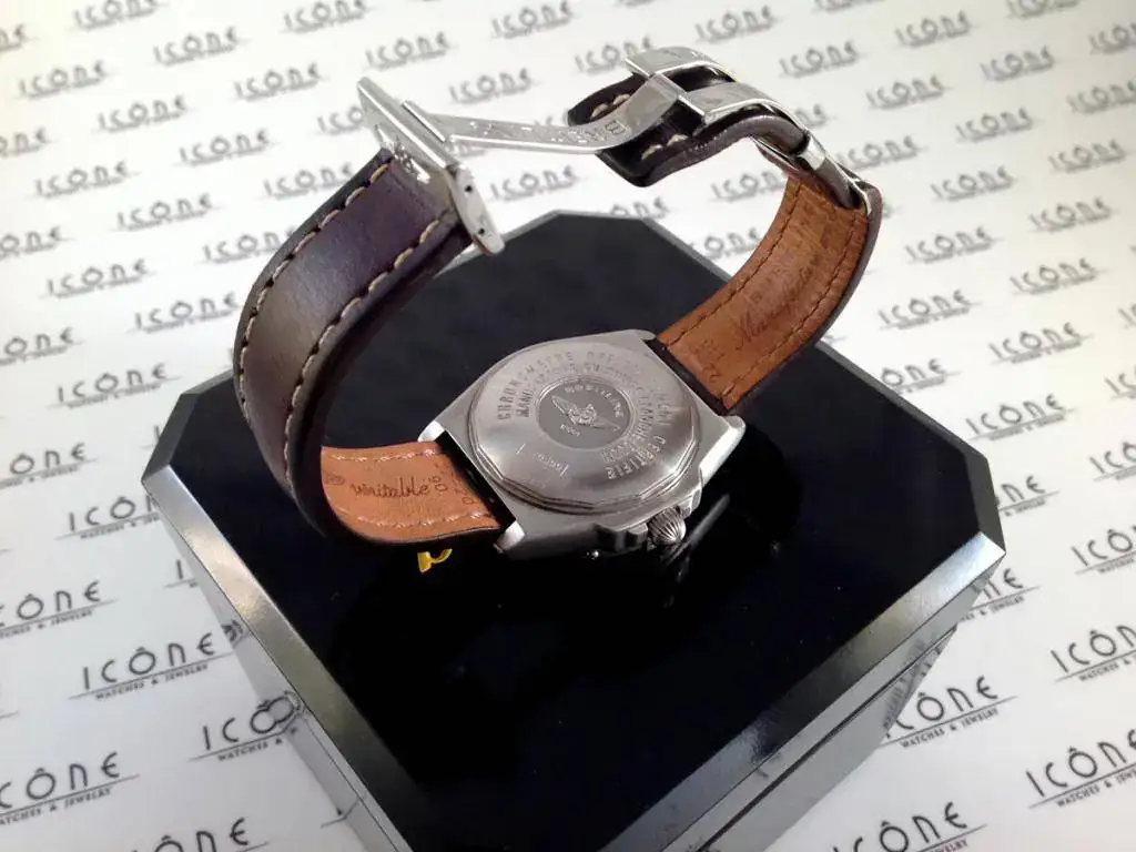 Las características son: Reloj automático con caja de 44mm., brazalete de cuero original con cierre desplegable Breitling, cristal de zafiro.