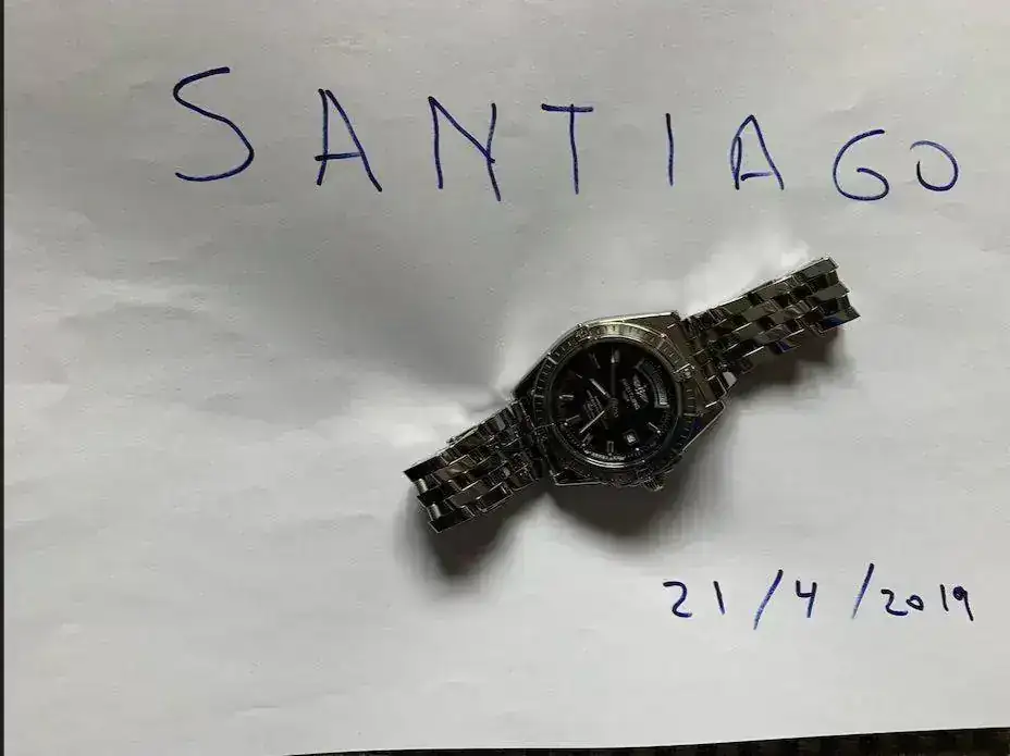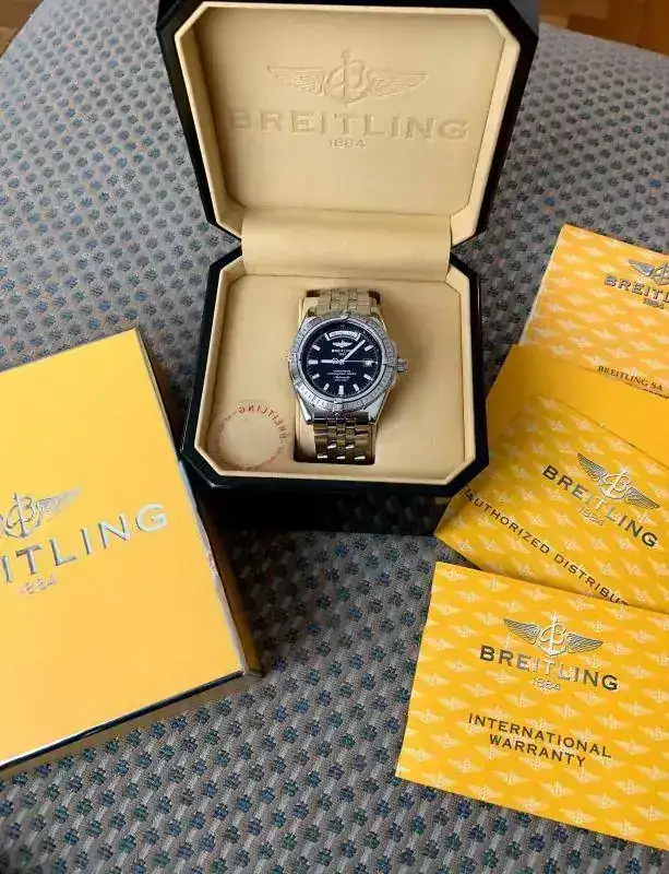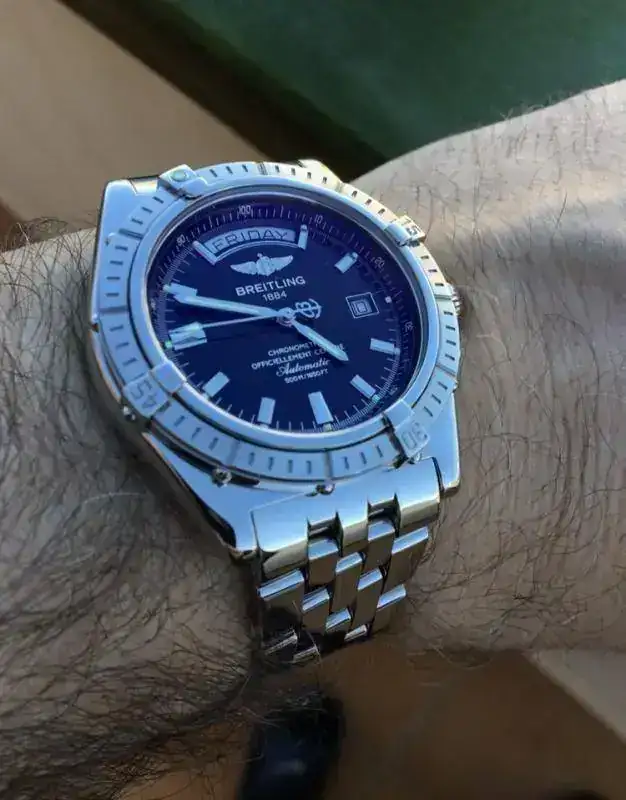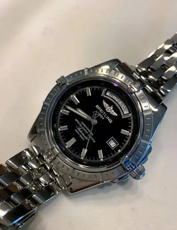 La esfera es negra, con los apliques horarios y escudo Breitling en plata rodiada, corona a rosca, datario a las 3 y semanario a las 12.