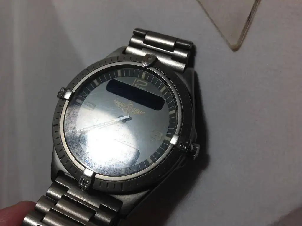 Es un reloj con caja y ármix de titanio que ha tenido un uso cuidadoso y salvo algún roce en una de las asas, visible en la fotografía, no tiene defectos reseñables. El cristal de zafiro parece en perfecto estado, limpio y transparente, aunque con luz intensa y con el reloj en un ángulo determinado pueden verse roces que no se observan en el uso diario.