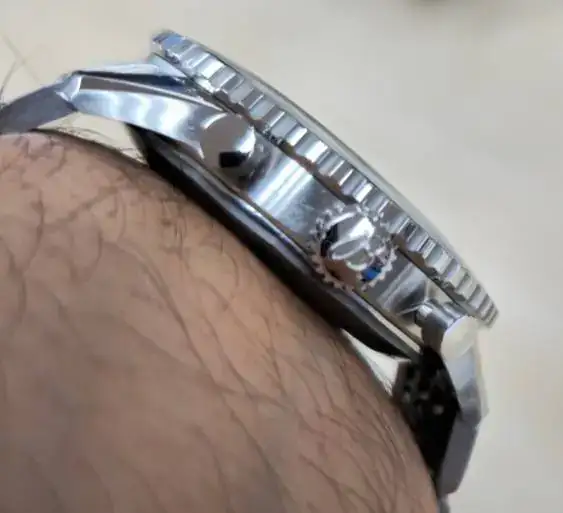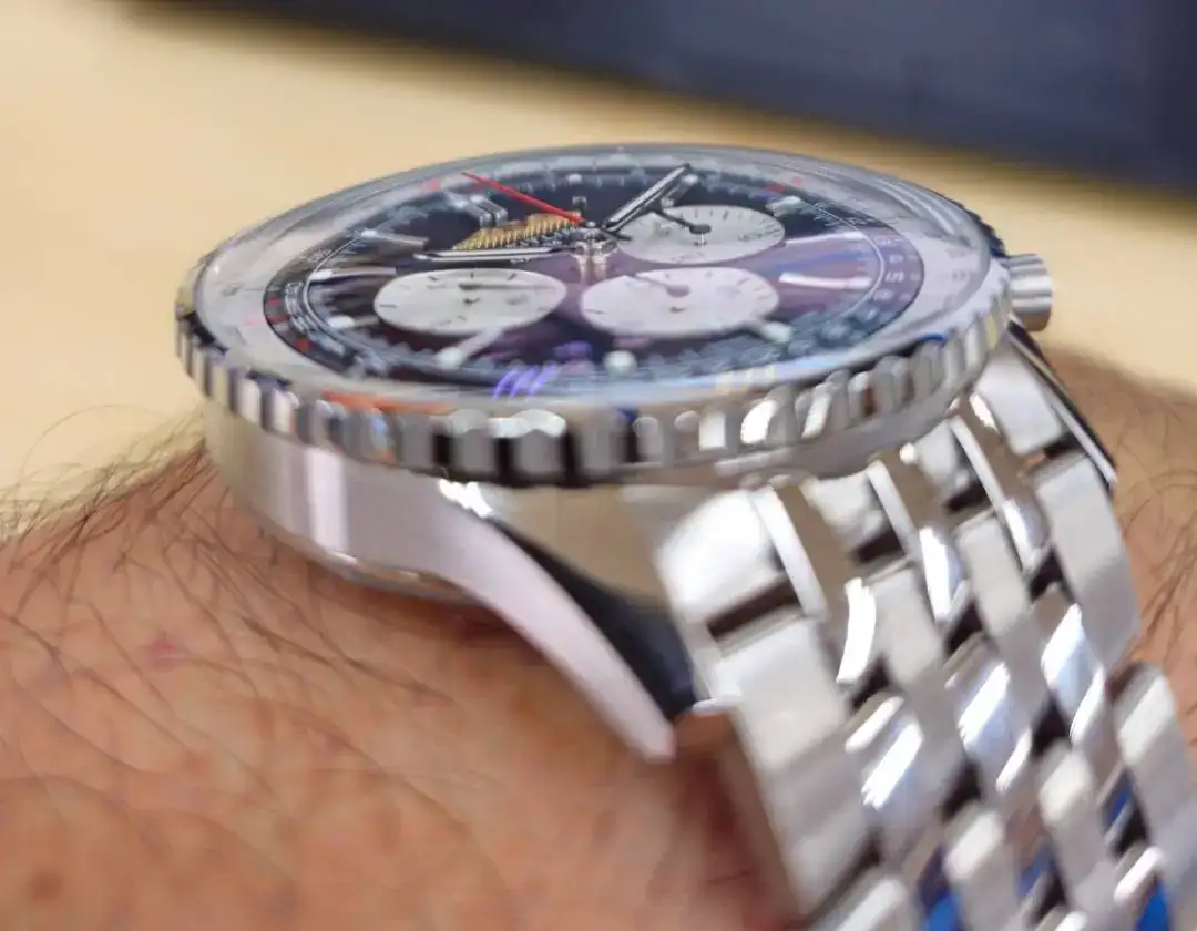 El reloj aun con sus 46mm asienta de manera muy cómoda ya que sus asas son cortas, en mi muñeca (18-18,5) se siente de los relojes más cómodos que tengo ya que el espesor de la caja para ser un cronográfo, es bastante contenido.