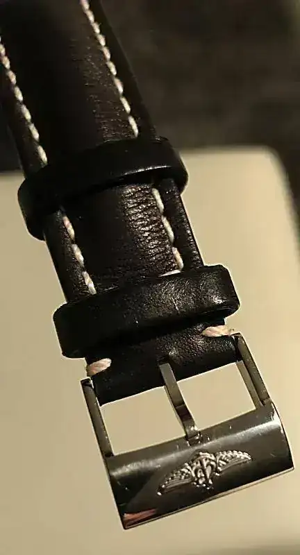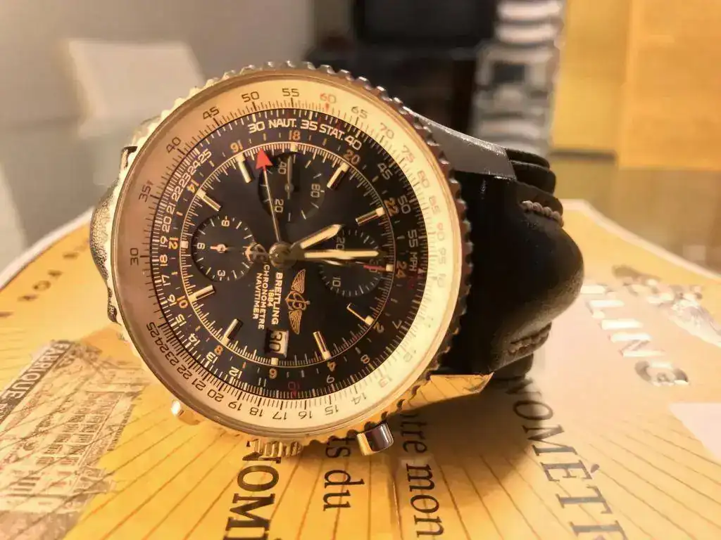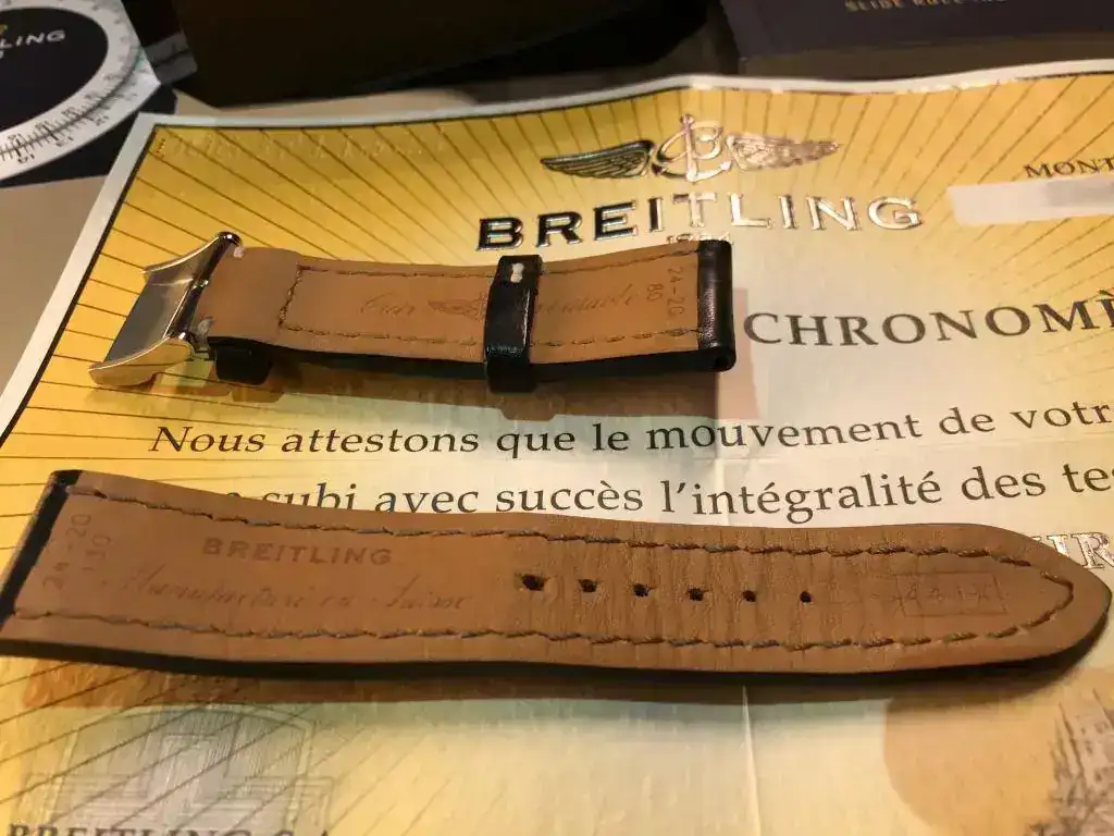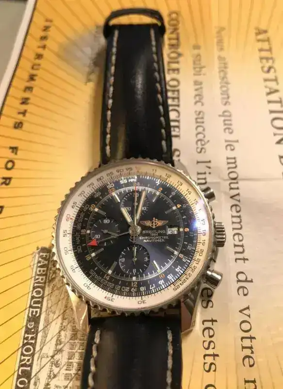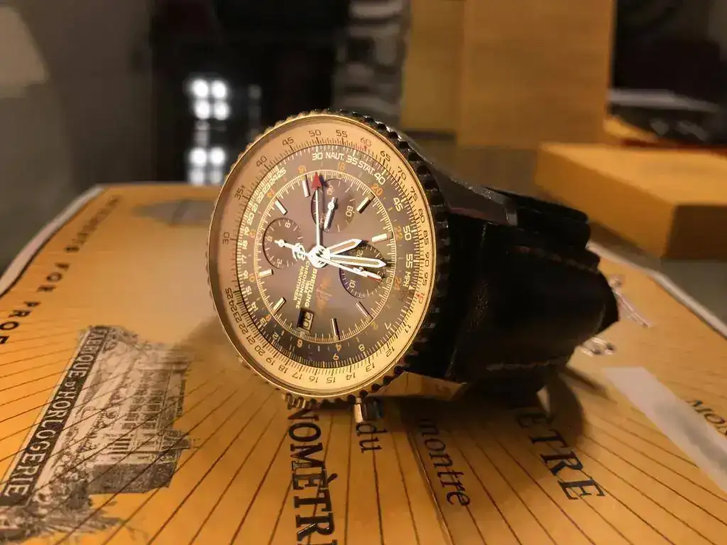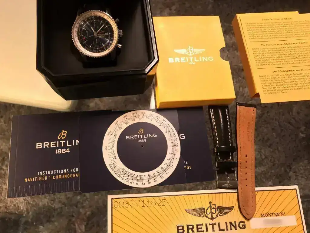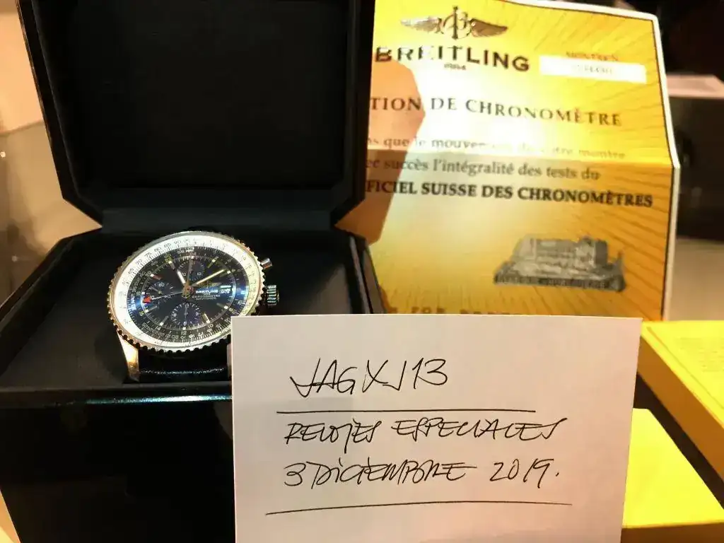 En esta ocasión le toca al Breit Navi abandonar la casa. El reloj está en buen estado tanto estético como de marcha. Lleva puesta una correa azul de piel aftermarket montada y la negra original con su ardillón (también original) sin uso. La dotación es completa con su caja de baquelita e incluye el dial / regla de cálculo comprado posteriormente para completar la dotación, además de su manual, su certificado COSC y sus características cajas de cartón amarillo.