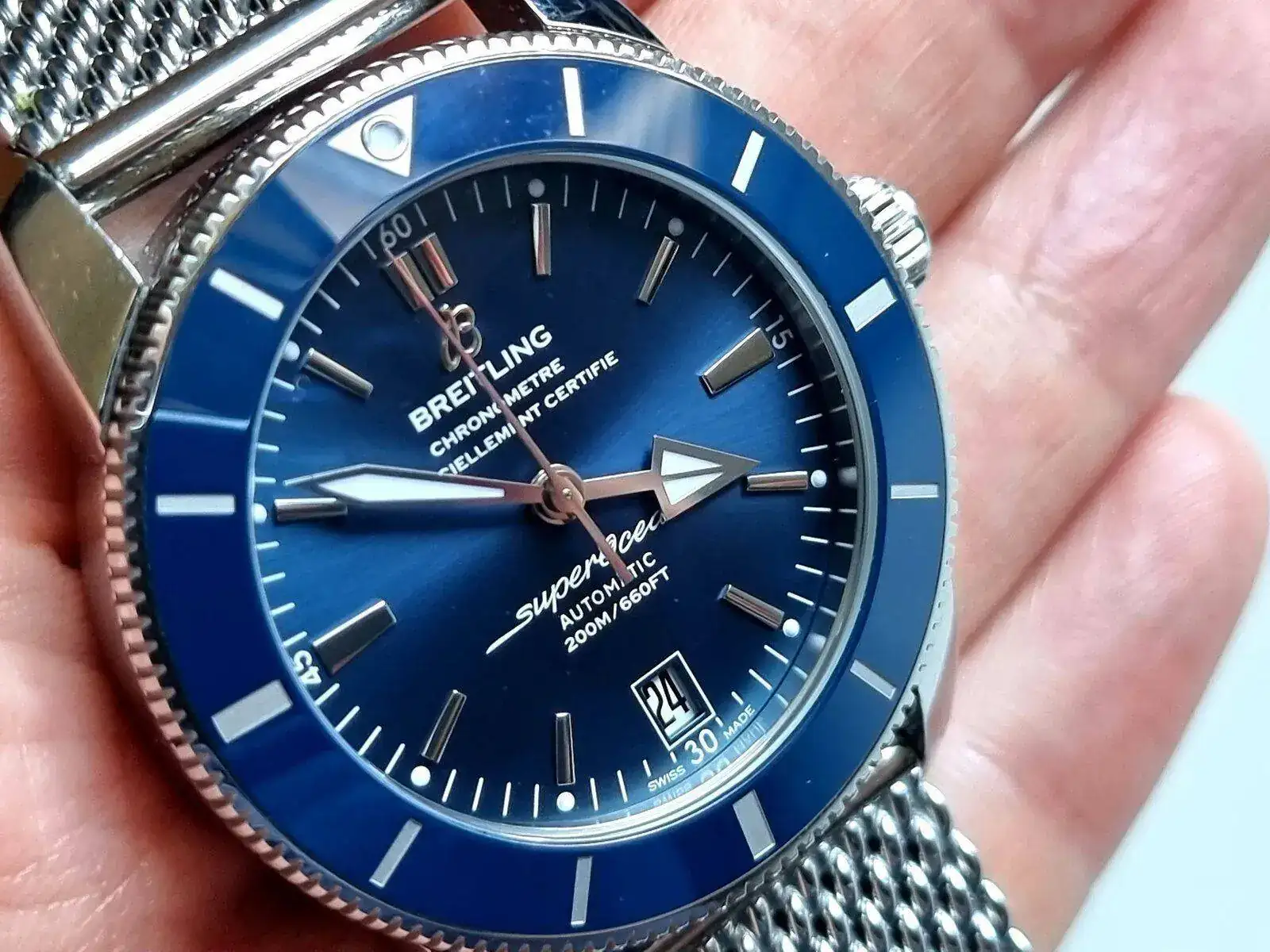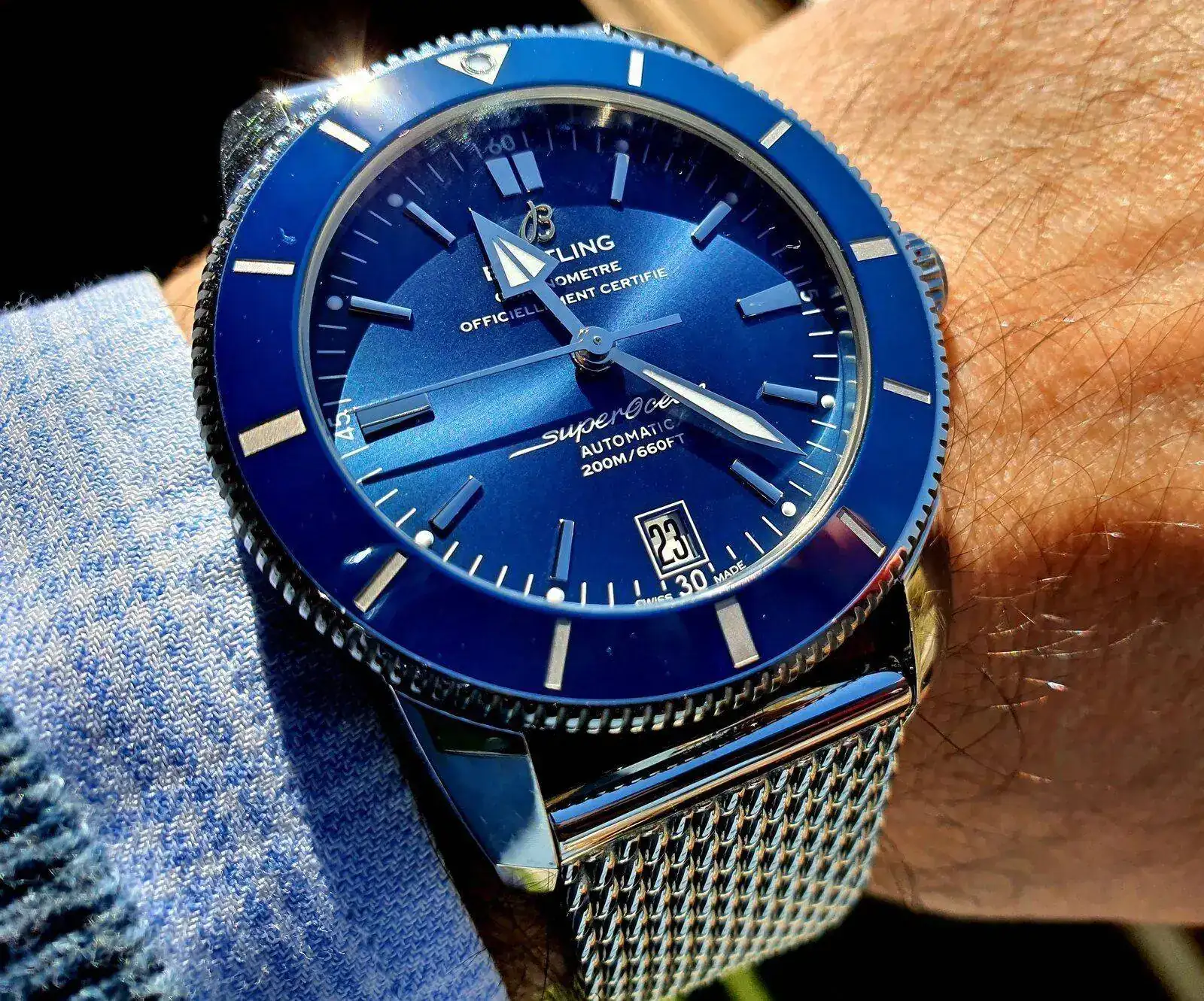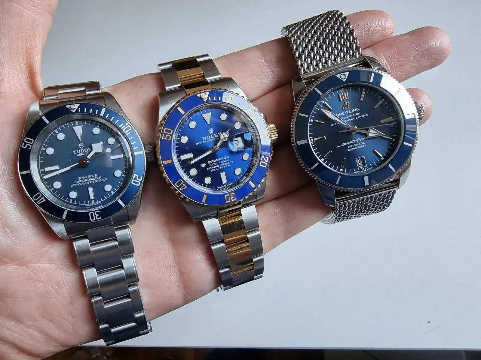 Son dos relojes muy diferentes, el Tudor es mas herramienta, mas de batalla el Breitling es mas lujoso, mas llamativo. El modelo en Azul lo he tenido bastante tiempo y es precioso los acabados son estupendos, la sensación de calidad que transmite lo elegante que es, el dial, las agujas... es maravilloso. Me deshice de el cuando adquirí el Sub mixto en azul y ya no iba a ver mucha muñeca.