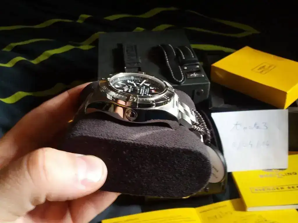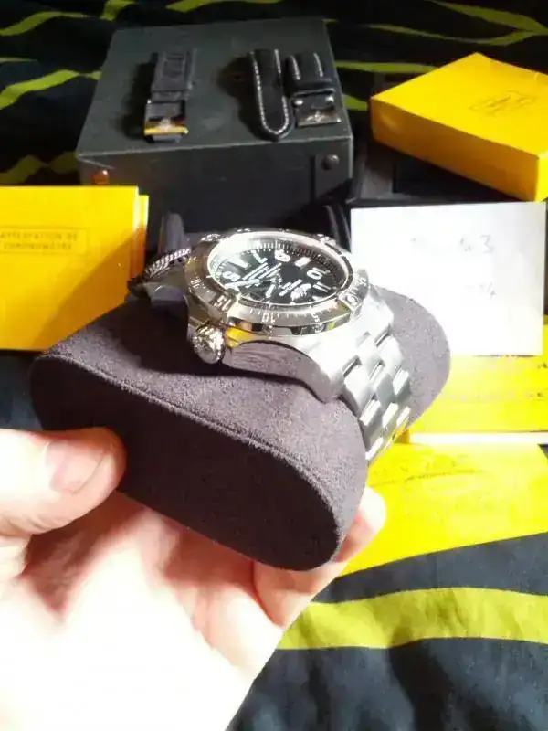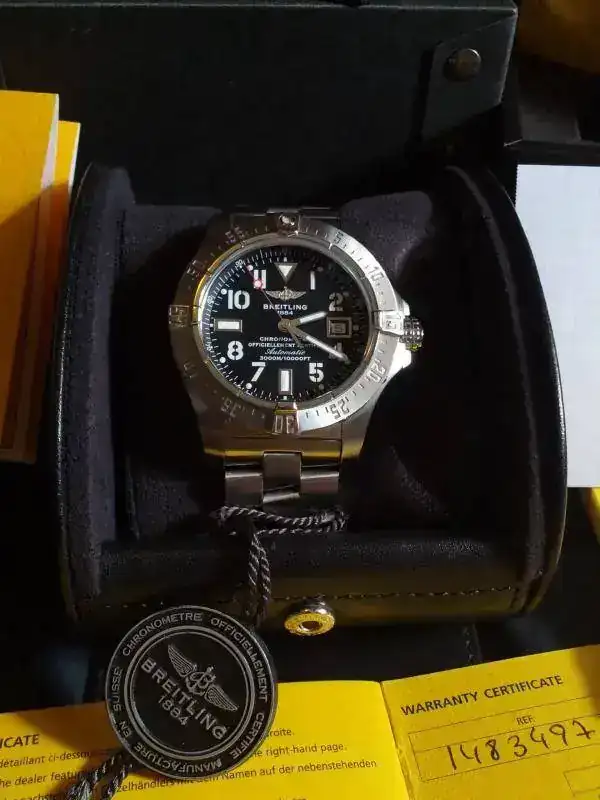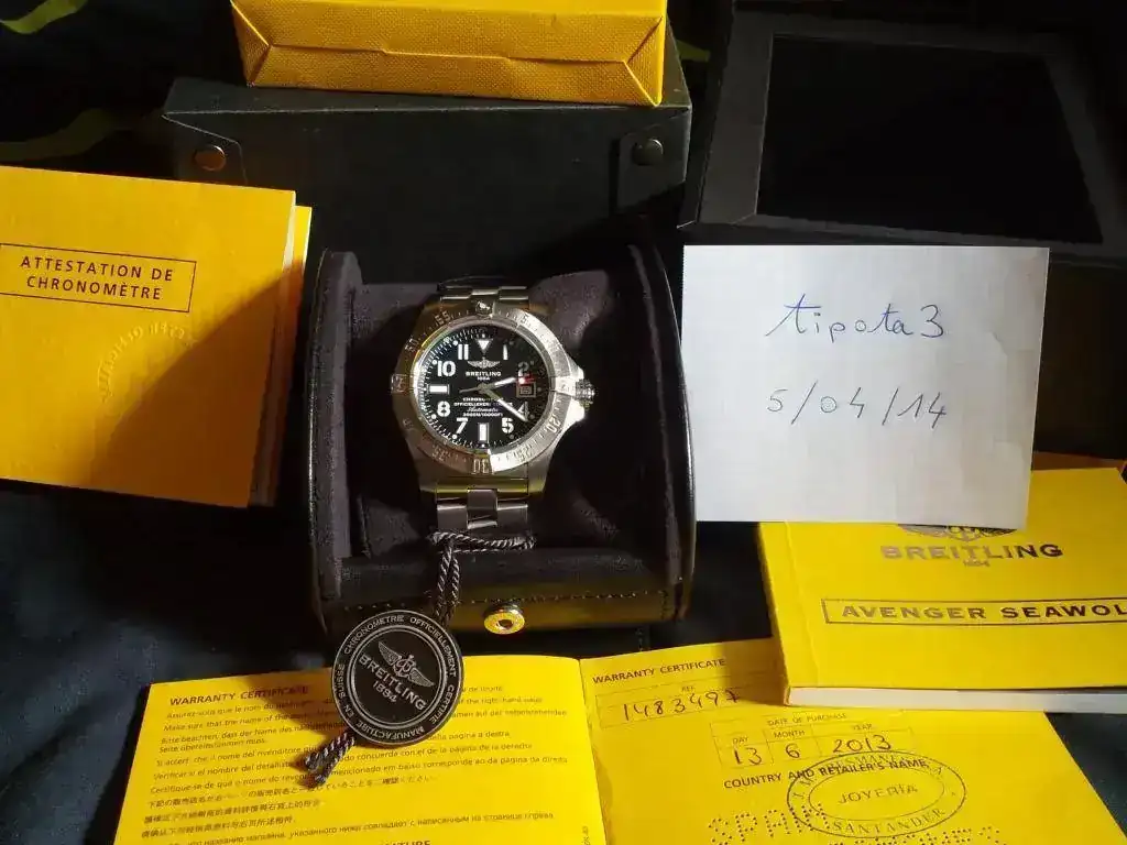 El reloj esta en un muy bueno estado, viene completito. Cajas, papeles, certificado COSC, tarjeta de garantia fechada y sellada por AD nacional. Adjunto como extra, dos correas Breitling negras. Una de piel con su hebilla firmada de la casa y una pro diver nueva para estrenar. El reloj esta en garantia por todavia mas de un año. Su marcha es espectacular +1s/24h.