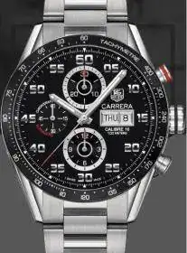E) Tag Heuer Carrera Calibre 16 Day-Date, reloj muy bonito, con cronógrafo, calibre de la familia Valjoux 7750 creo, al igual que el Omega. 43mm. 100 metros.