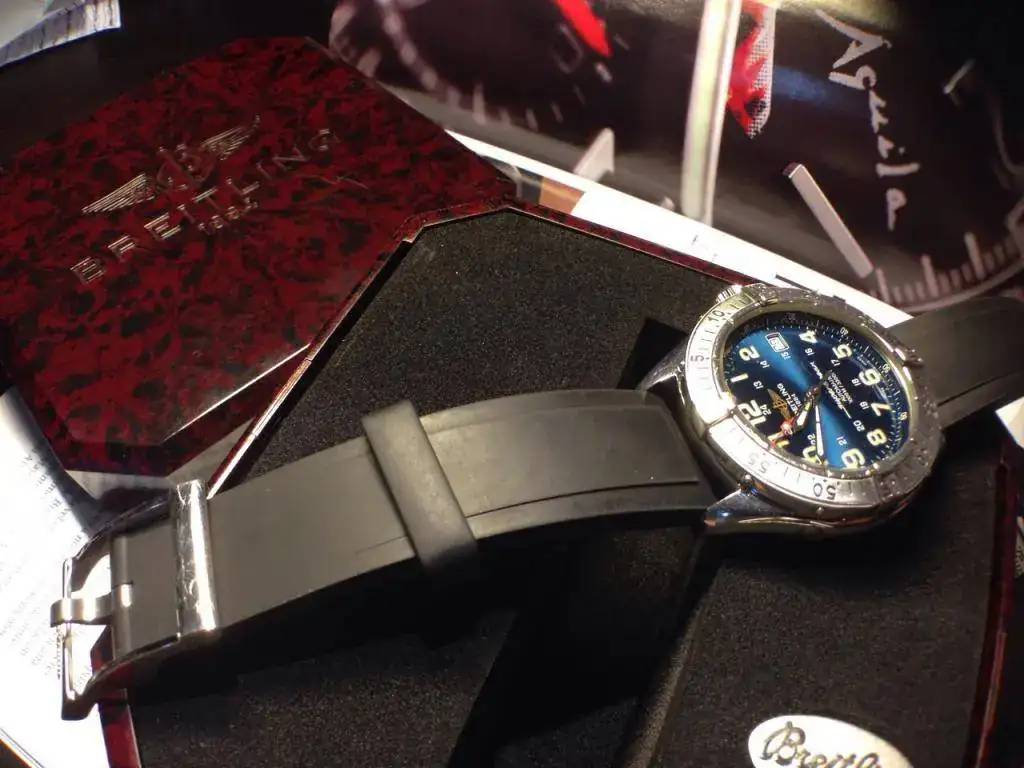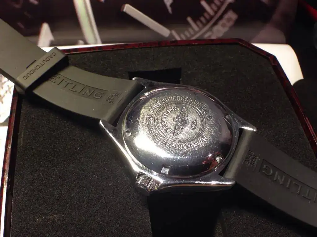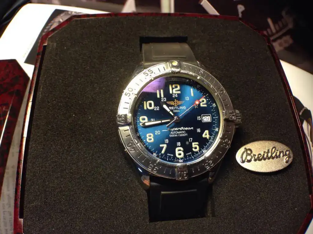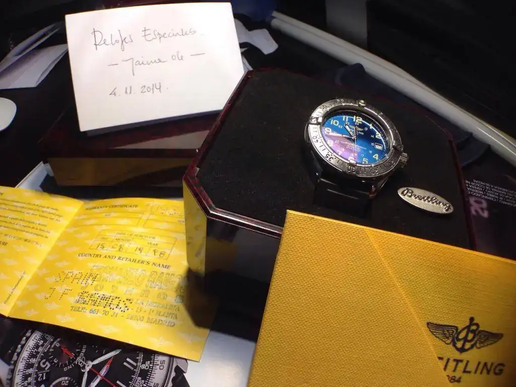 - Otro que le toca salir de la caja………..Saco este Breitling Superocean 1000 m. El reloj se encuentra en buen estado general, con algunas marcas de uso, lleva puesta una correa de caucho original con hebilla original con muy poco uso, en definitiva un bonito reloj y cómodo que para mí goza de una excelente relación calidad/precio. El reloj cuenta con su caja de baquelita, libretos y la garantía (caducada).