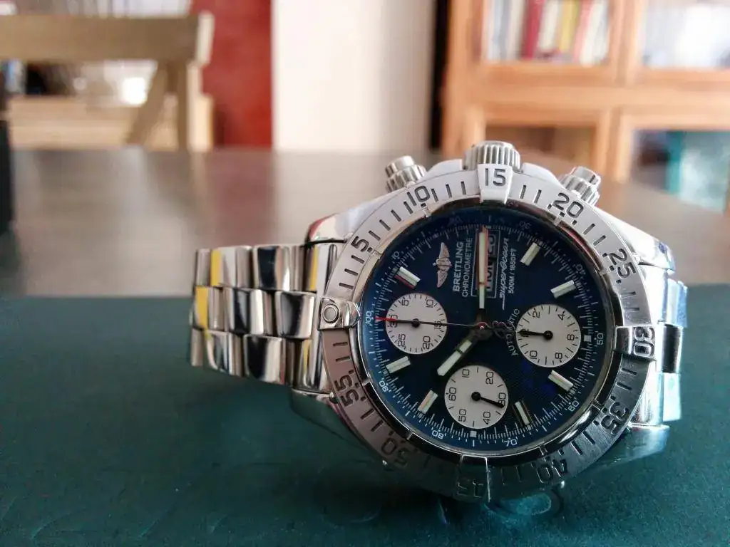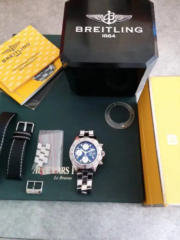 Reestructurando la caja de relojes saco a la venta mi Breitling Superocean Chrono en azul con subesferas blancas. El reloj se entrega con toda la dotación, caja exterior amarilla, interior de baquelita negra en perfecto estado, armis completo, instrucciones y garantía (ya caducada) más una hebilla original breitling por si le quieres poner correa de piel, y otra correa de carbono usada que le va perfecta.