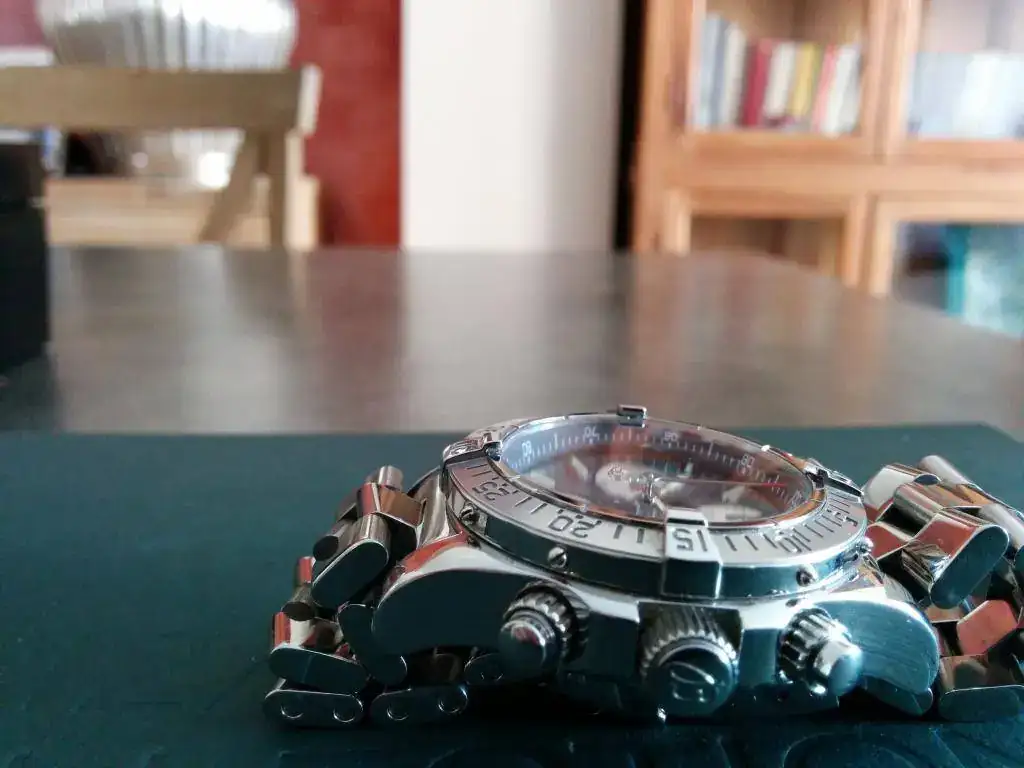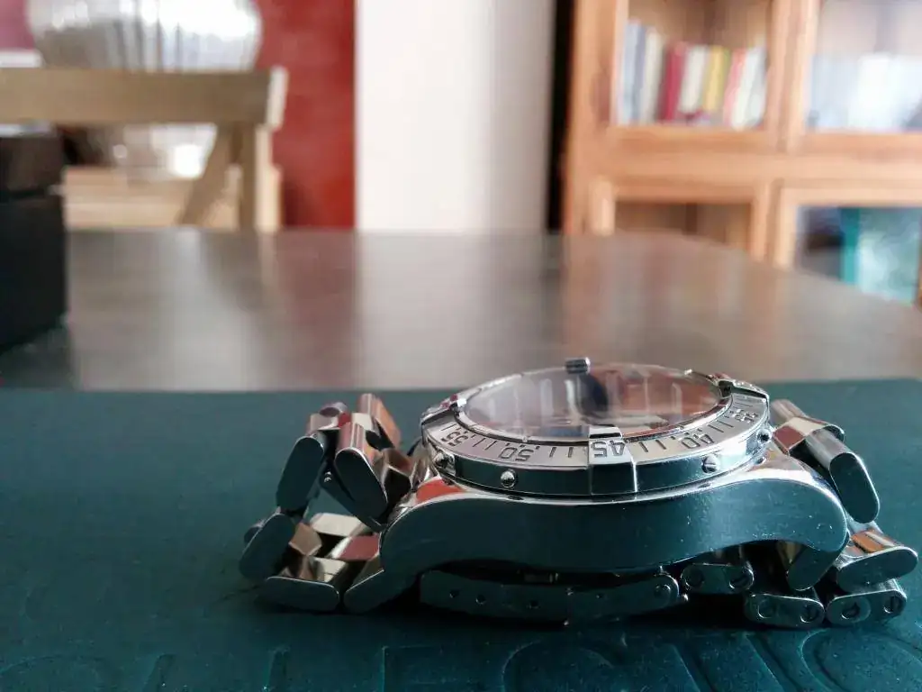 El estado del reloj es de funcionamiento correcto (no lo controlo en exceso ya que roto los relojes mucho pero me parece muy bien ajustado), zafiro impecable, armis con típicos pelillos y la caja perfecta salvo por un pelillo/arañazo bajo el pulsador situado a las 4, nada que no salga con un pulido leve pero yo he preferido dejarlo asi (aunque todo hay que decirlo