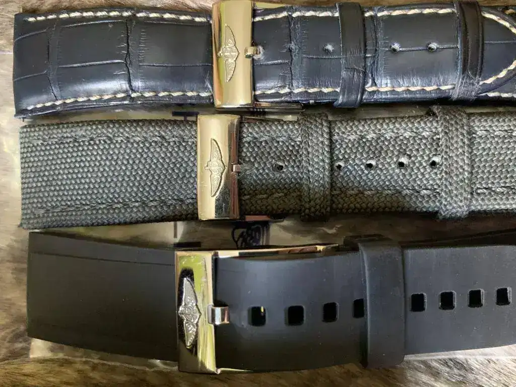 Correa: Caucho Ocean Racer con deployante (16cm el caucho- valor nuevo 50euros)+ Canvas militar OEM Breitling, + Caucho breitling+Cocodrilo legítimo gris con bucle Breitling.