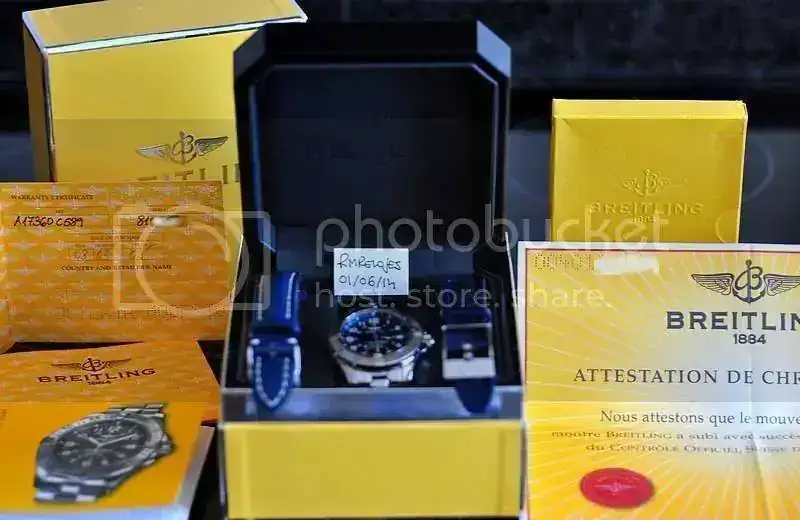 El reloj se entrega con absolutamente todo su set: Caja amarilla exterior, caja interior de baquelita, cajita amarilla portadocumentos, certificado C.O.S.C, garantía sellada en distribuidor nacional en 2005, librillo de instrucciones y de distribuidores Breitling... TODO! y, además, se incluye: