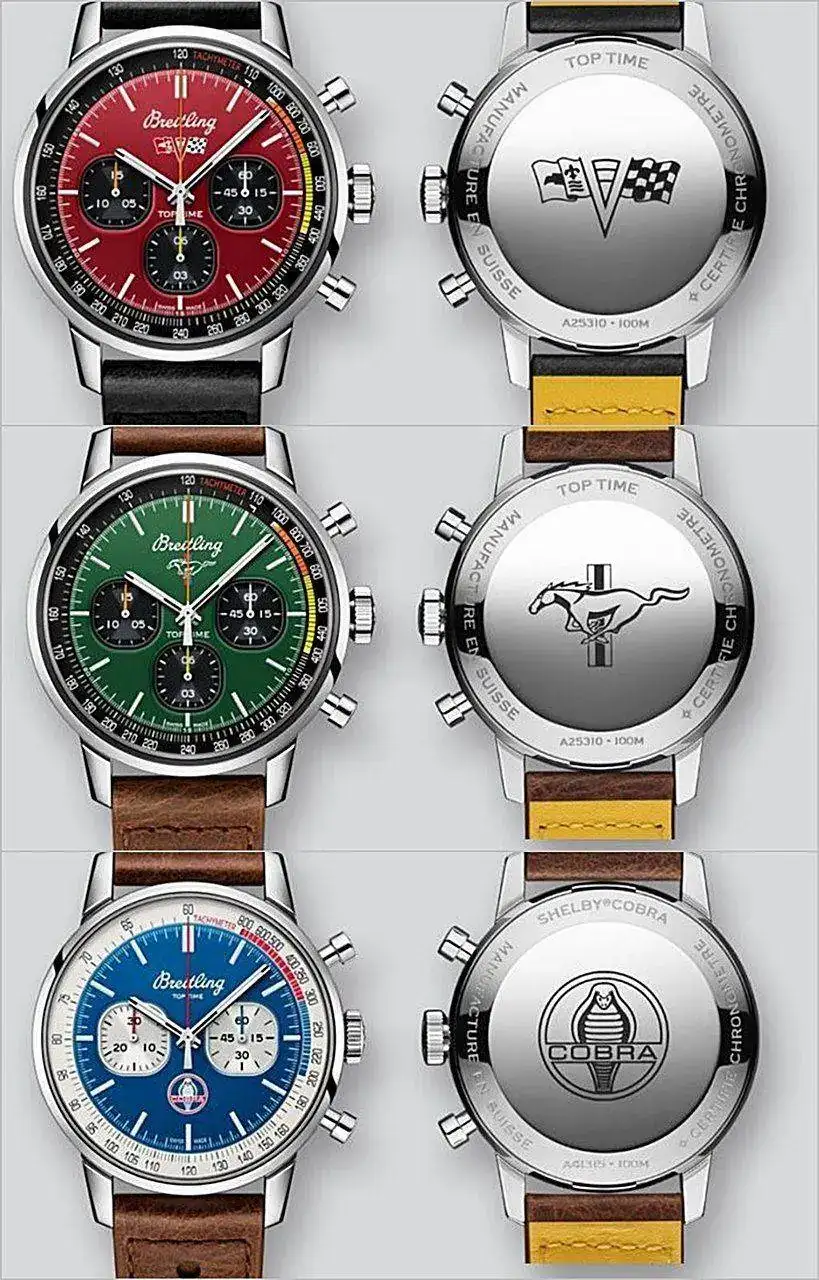 Insistiendo en su (re)orientación más a lifestyle que a la relojería mecánica propiamente dicha, y después de las ediciones limitadas Top Time y Top Time Deus, la colección cápsula Top Time Classic Cars rinde homenaje ahora a los coches deportivos clásicos de la década de 1960, a saber: Chevrolet Corvette, Ford Mustang y Shelby Cobra (este último ya "había salido" en Baume & Mercier hace un par de años)