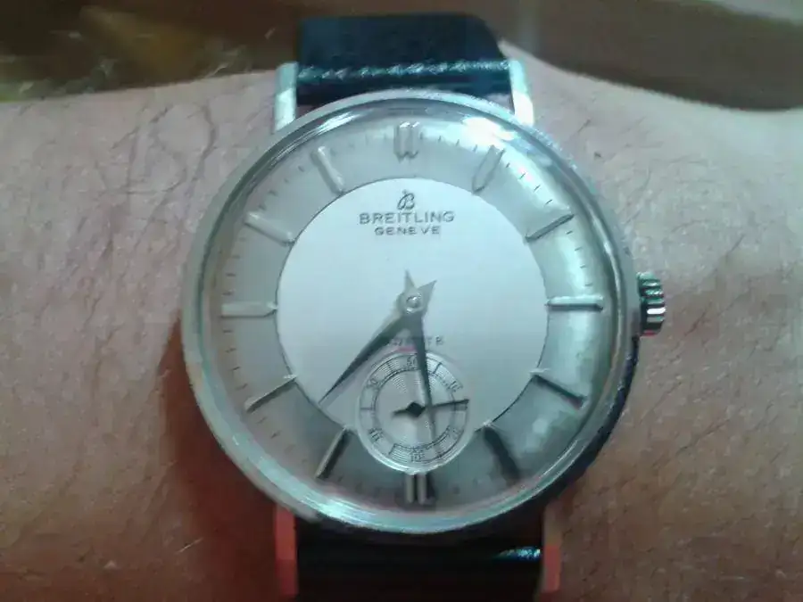 El reloj lleva una caja de acero inoxidable firmada por Breitling ,con la referencia 1459.Corona de acero no firmada.Calibre manual en su interior,esfera con la marca Breitling Geneve y en dos tonos ,uno exterior en gris,con un ligero desvanecimiento del color entre las cuatro y las cinco,y uno interior impecable.Agujas tipo Dauphine y un plexy en muuuy buen estado.