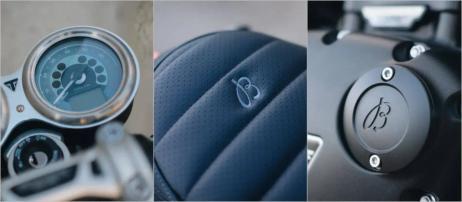 Codiseñados por Breitling, los indicadores de velocidad y RPM de la motocicleta adaptan el estilo del diseño de la esfera del Top Time Triumph.