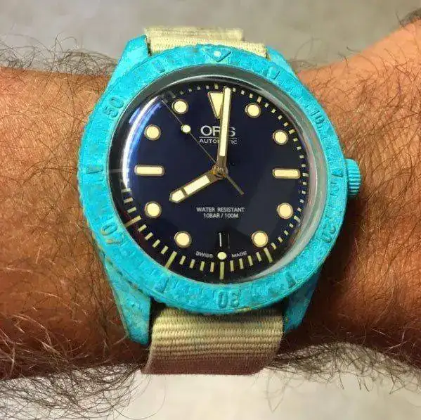 Me parece maravilloso.Y con un fuerte martillazo en el cristal ya de leyenda.Al principio lo pensé por el estado de la correa; no es solo el bronce de caja y bisel: La correa también está tocada.