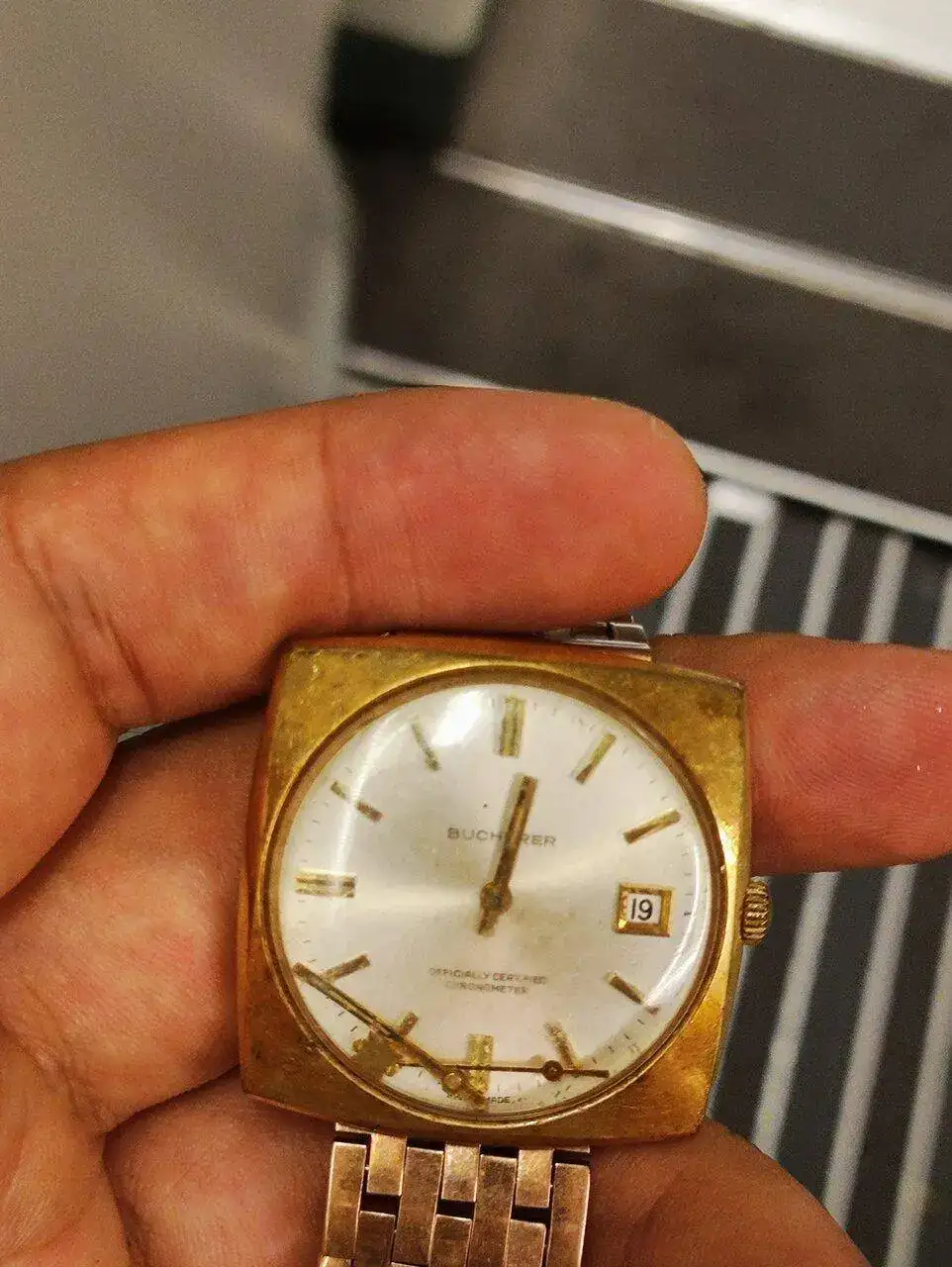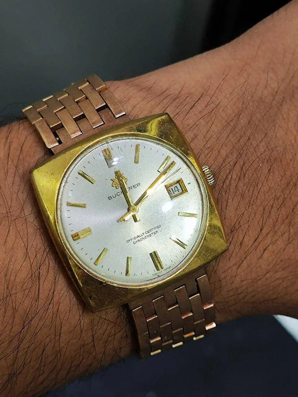 Hola buenas, me presento, me llamo David y vivo en Barcelona, mi padre me ha dado un reloj que le dieron cuando él trabaja en una naviera, nunca había escuchado de la marca, es un Bucherer, llevo tiempo leyendo este foro pero me acabo de registrar a ver si me podéis echar una mano, en la parte trasera no he encontrado nada que pueda identificar al reloj, sólo la insignia de la marca y el año en que fue fundada, en la parte delantera pone "Officially certified Chronometer", es de oro según me ha dicho mi padre. Buscando en google he encontrado uno que se vendió en una relojería en NY pero no decían el modelo. A ver si alguien me puede ayudar a encontrar el modelo, por otra parte, me podéis aconsejar de algun relojero en Barcelona o alrededores que me pueda dar presupuesto para repararlo? le di vueltas a la corona y cambia de fecha. Adjunto 2 fotos.
