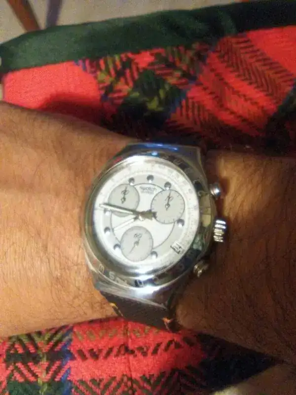 Escala taquímetro, 3 esferas, fechador a las 4, crono real, suiza, cuarzo.