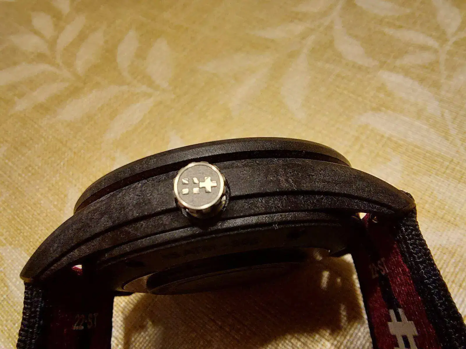 La caja en cambio de de carbono inyectado con un peso de 38g y 63 incluido la correa, conteniendo un calibre mecánico me parece un peso excelente, ahí podéis ver otro punto interesante del reloj, la corona es desplegable.
