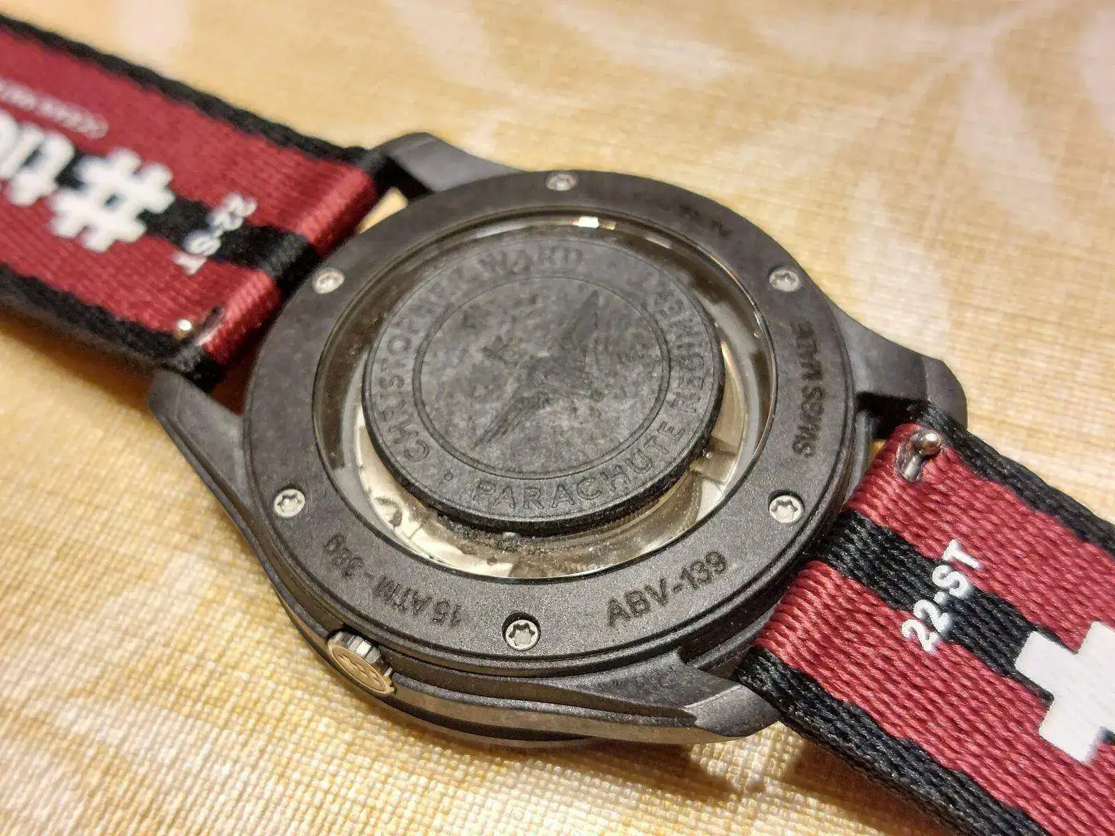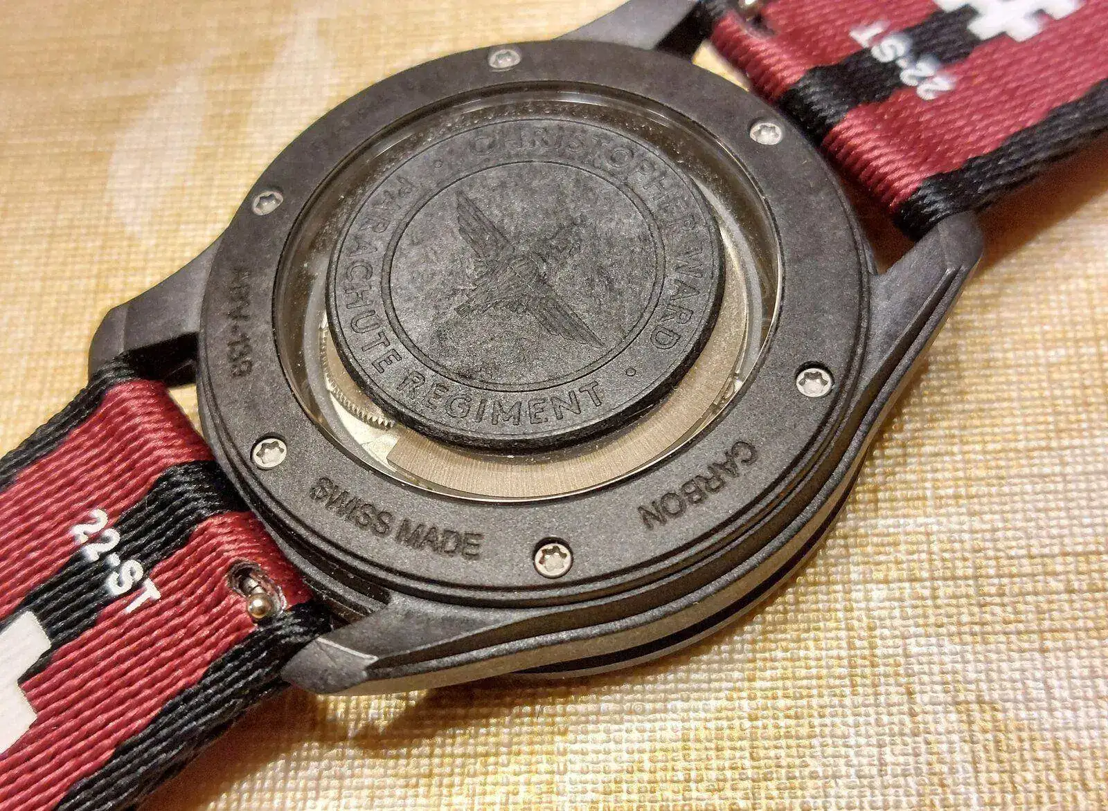 Dos fotos de la trasera, fondo de cristal de zafiro y sobre este han colocado una medalla también en carbono con el escudo de la brigada, por lo visto solo les dan permiso si el reloj cumple todos los requisitos para poder ser usado por el ejército británico.