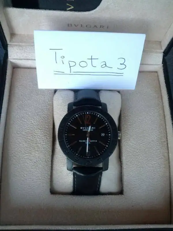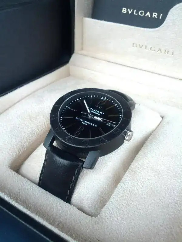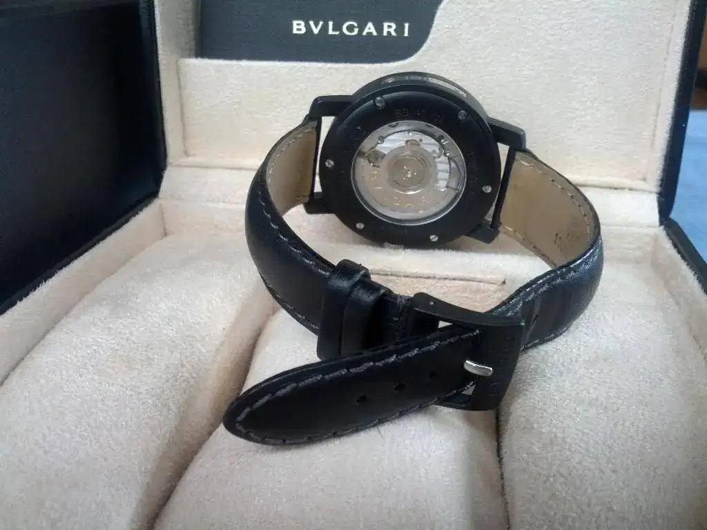Reloj en perfecto estado mecanico, caja de carbono de 40mm sin la corona, calibre automatico. La correa es de piel alomada y monta su cierre original de carbono y oro blanco Bulgari.