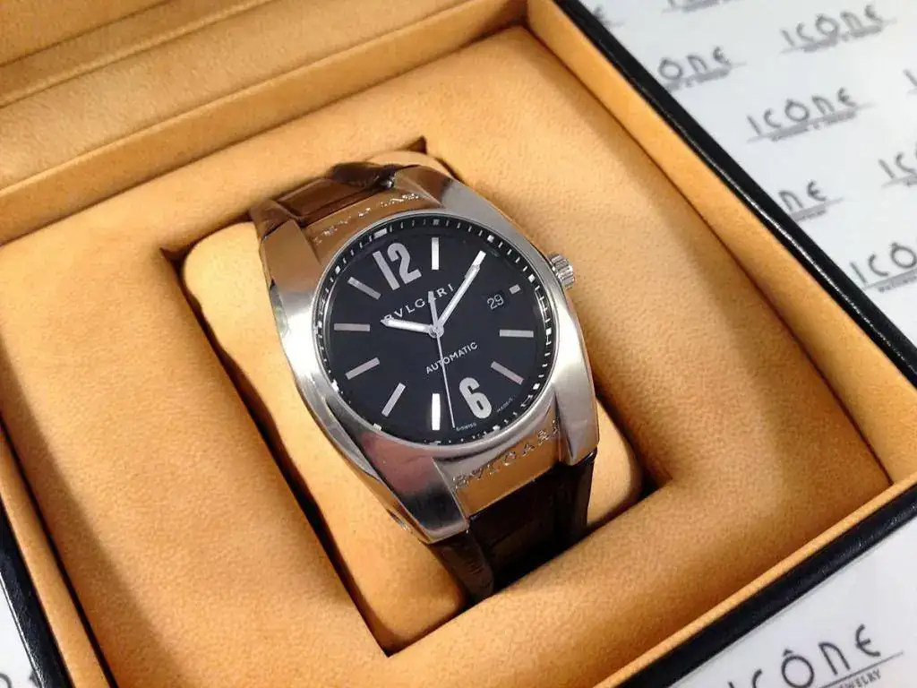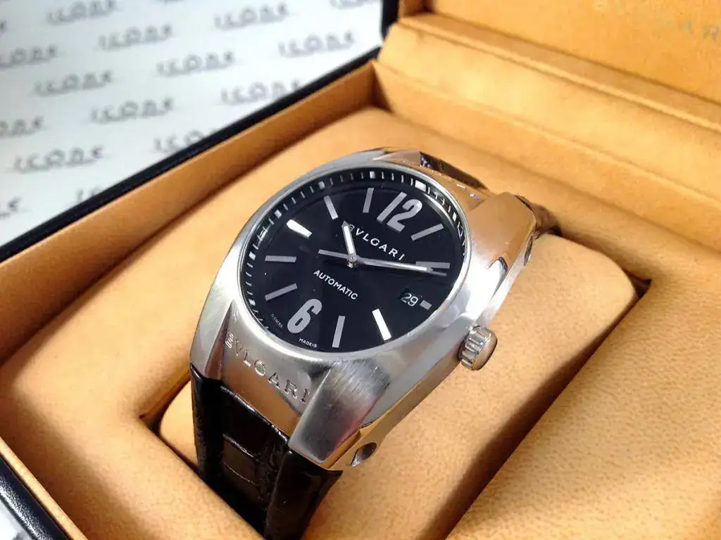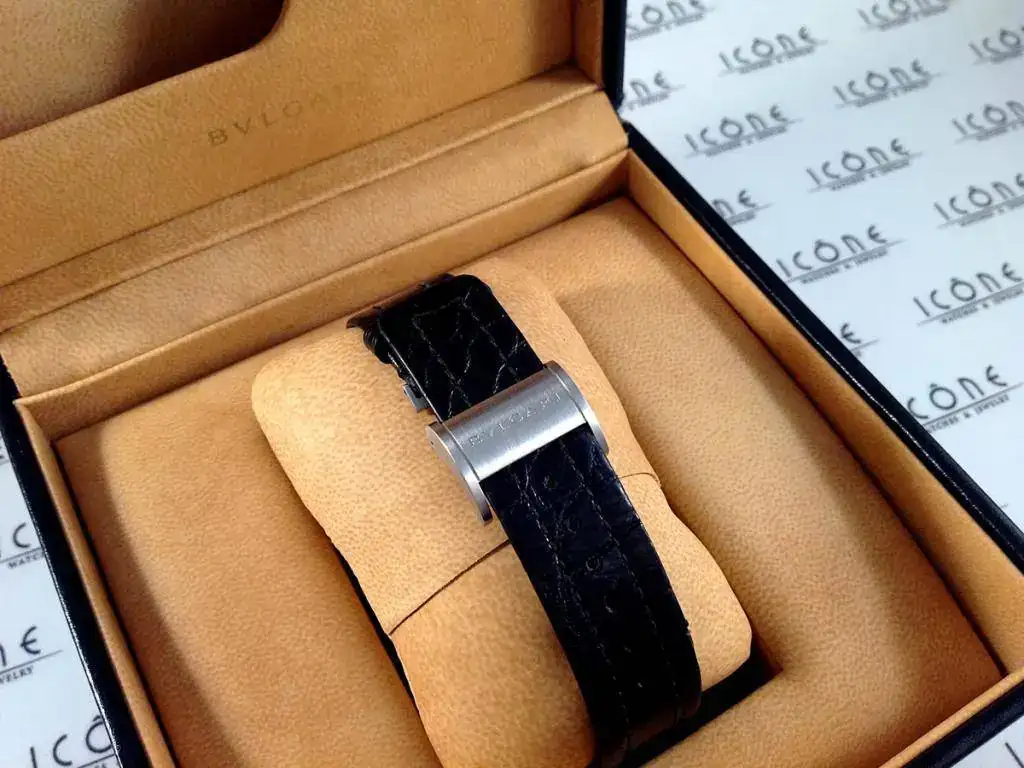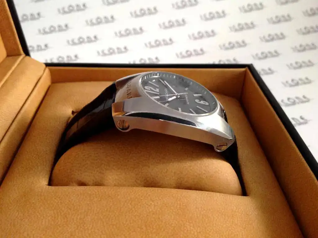 Las características son: Reloj automático con caja de 40 mm., brazalete de piel con cierre desplegable Bulgari, cristal de zafiro.