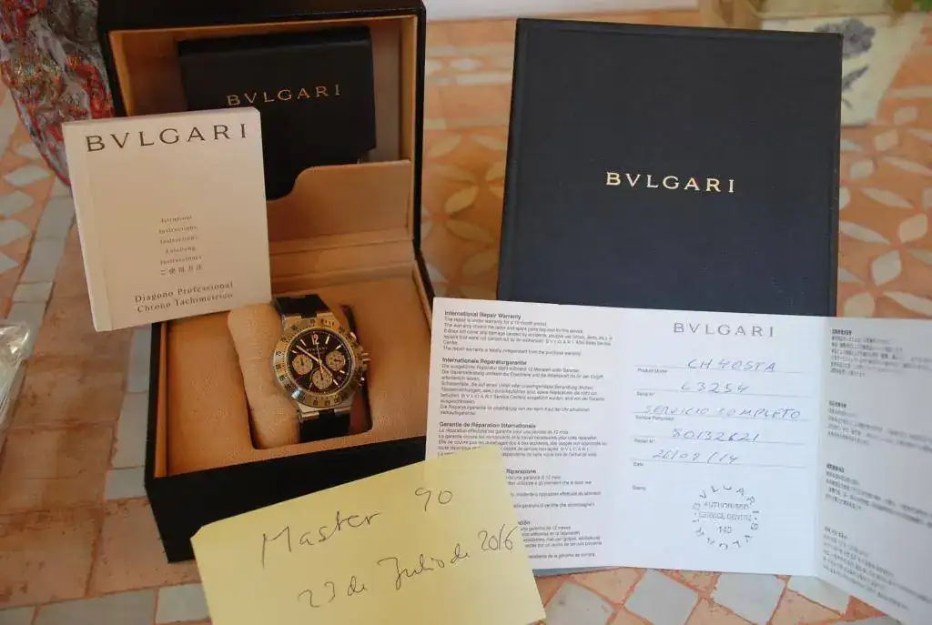 Hola a todos, pongo a la venta mi Bulgari Diagono Professional, el reloj se encuentra en un estado excelente, se podría decir impecable, a las fotos me remito. El reloj es de octubre de 2.003, y pasó una revisión completa en noviembre de 2.014 por importe de 490 euros, con su año de garantía oficial correspondiente. Se encuentra completo de documentación, tanto la de la comprar, como la de la revisión oficial. Cualquier información o fotos adicionales no tenéis mas que pedirlas