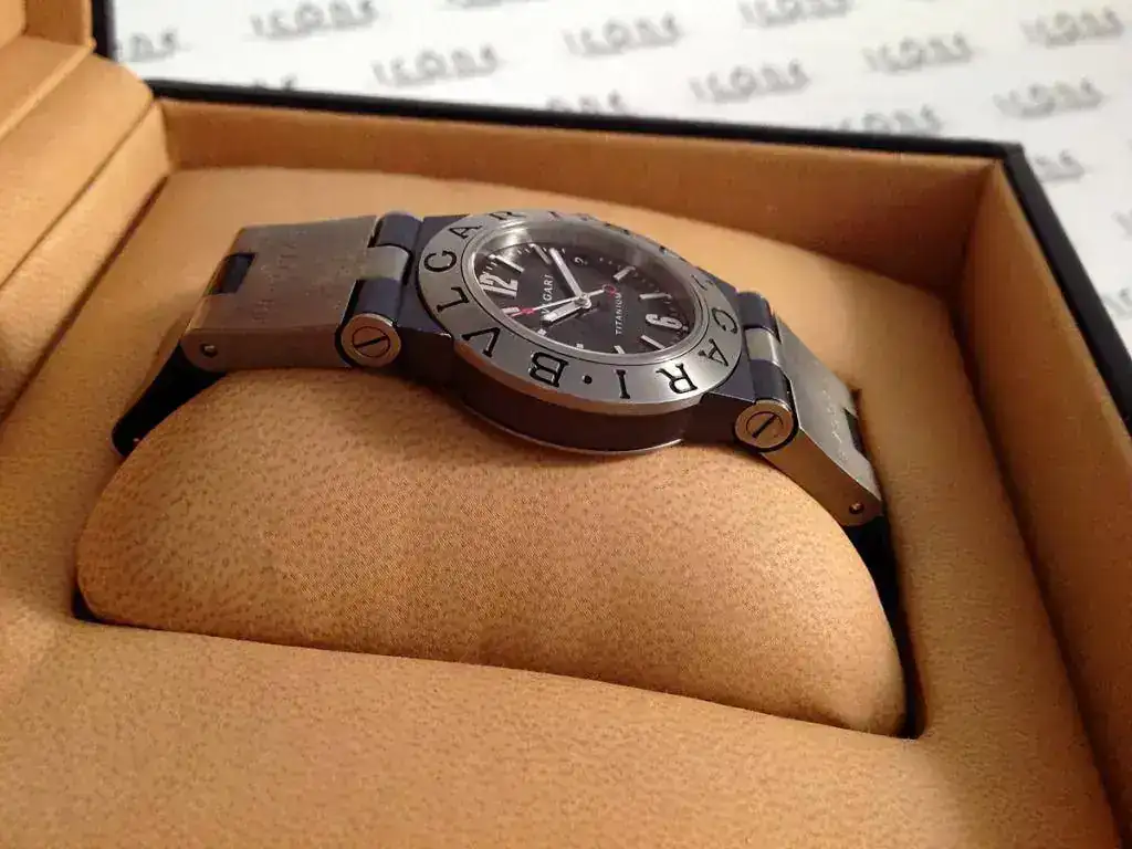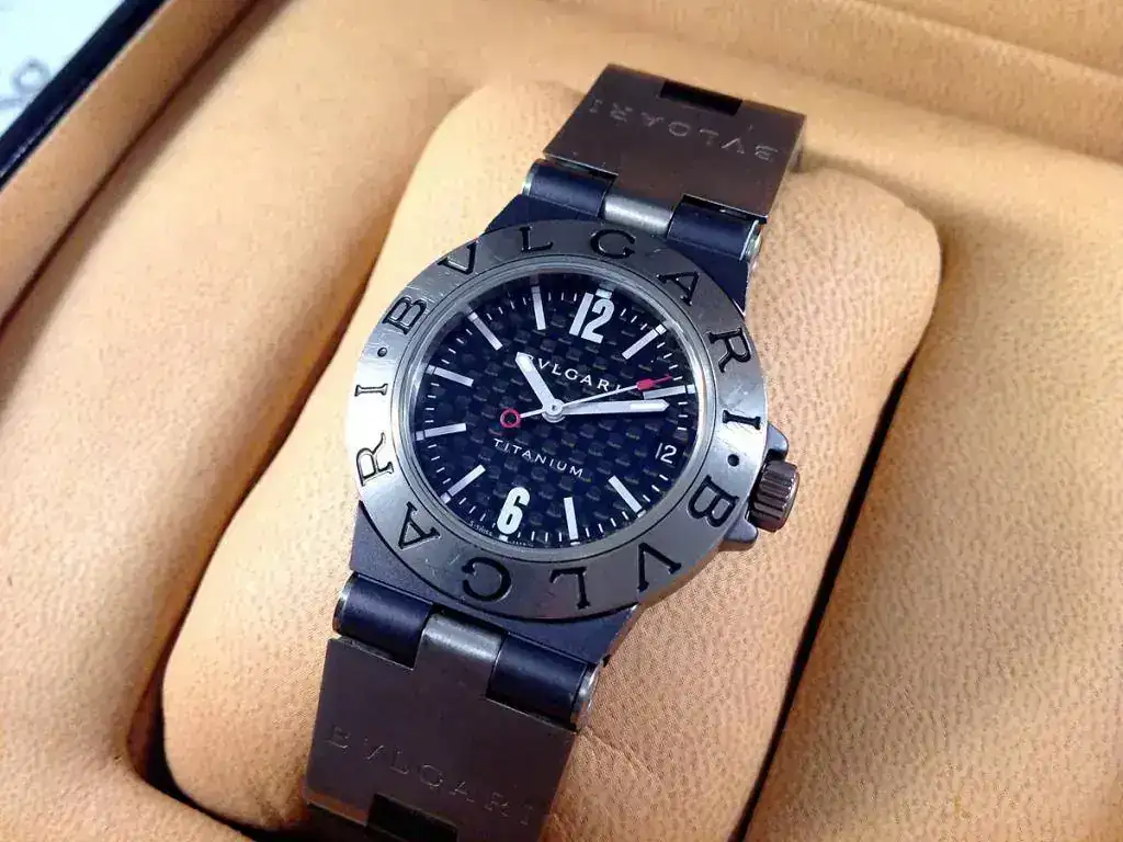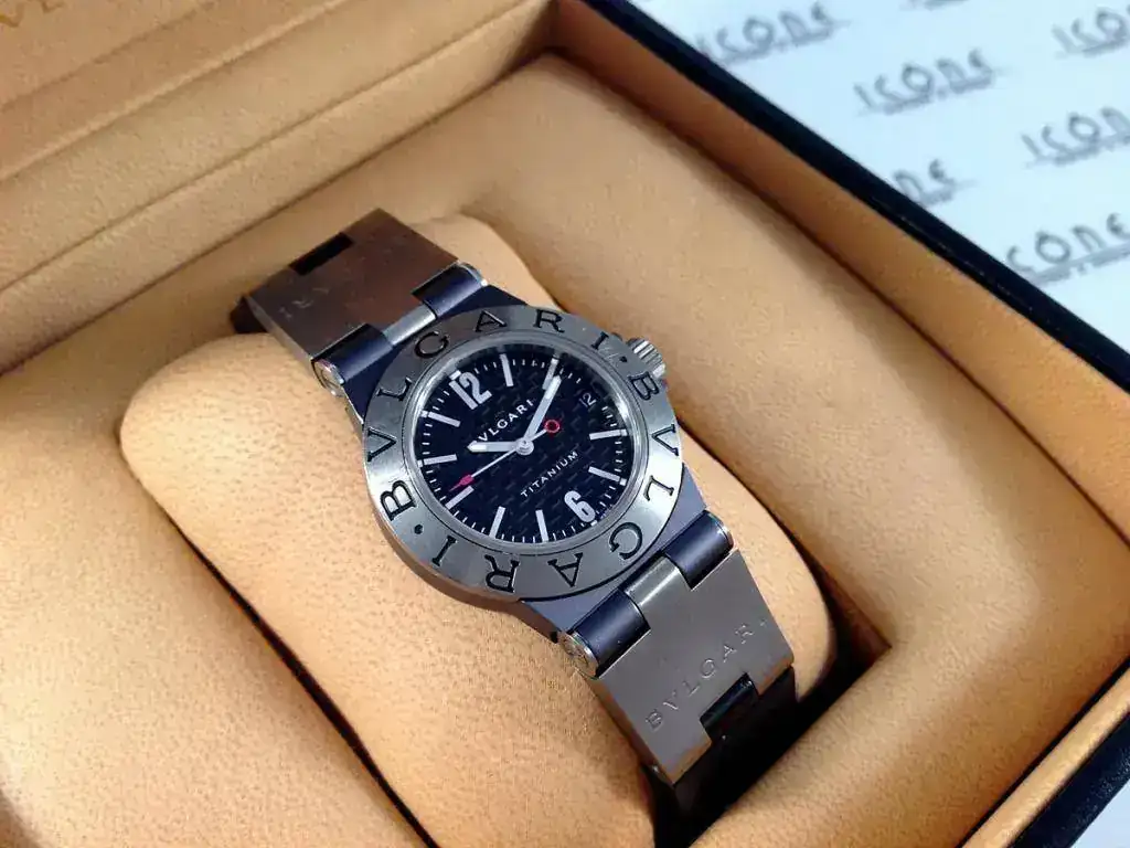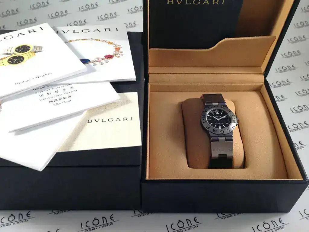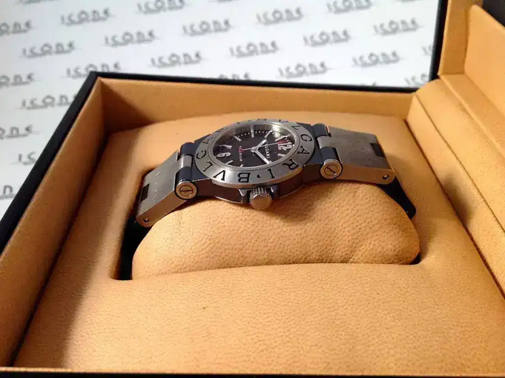 Las características son: Reloj de cuarzo con caja de 32mm., brazalete de titanio/caucho Bulgari, cristal de zafiro.