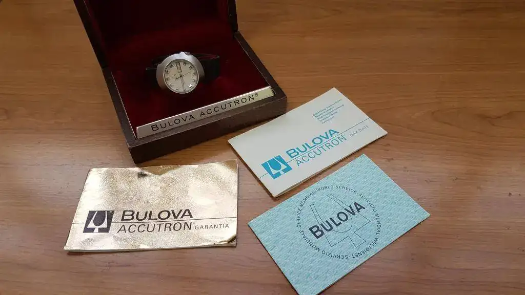 Se trata de un Bulova Accutron modelo 218 totalmente completo y original del año 1972. Es decir, reloj con su preciosa caja de madera original y documentación completa, cosa difícil de encontrar. (Garantía caducada como es lógico)