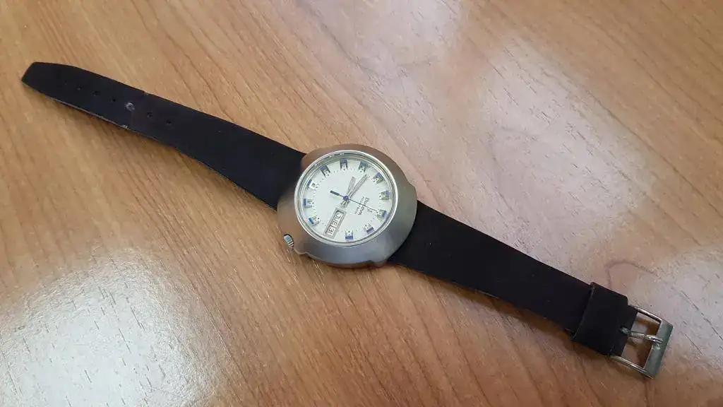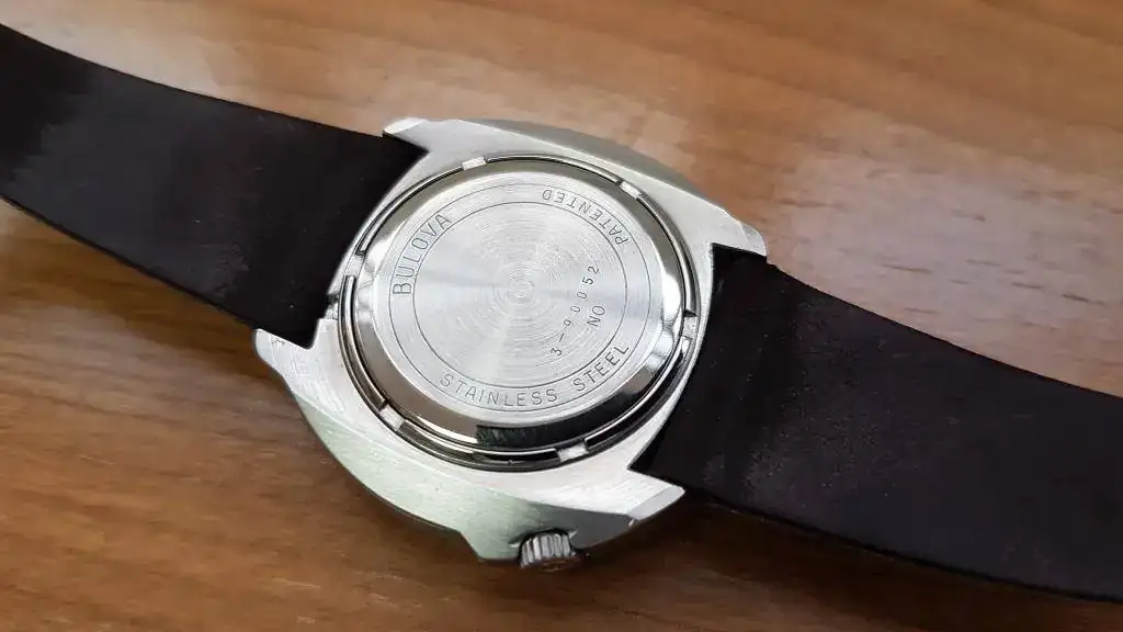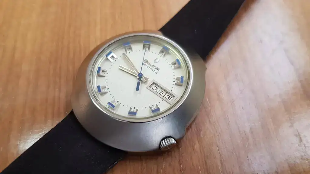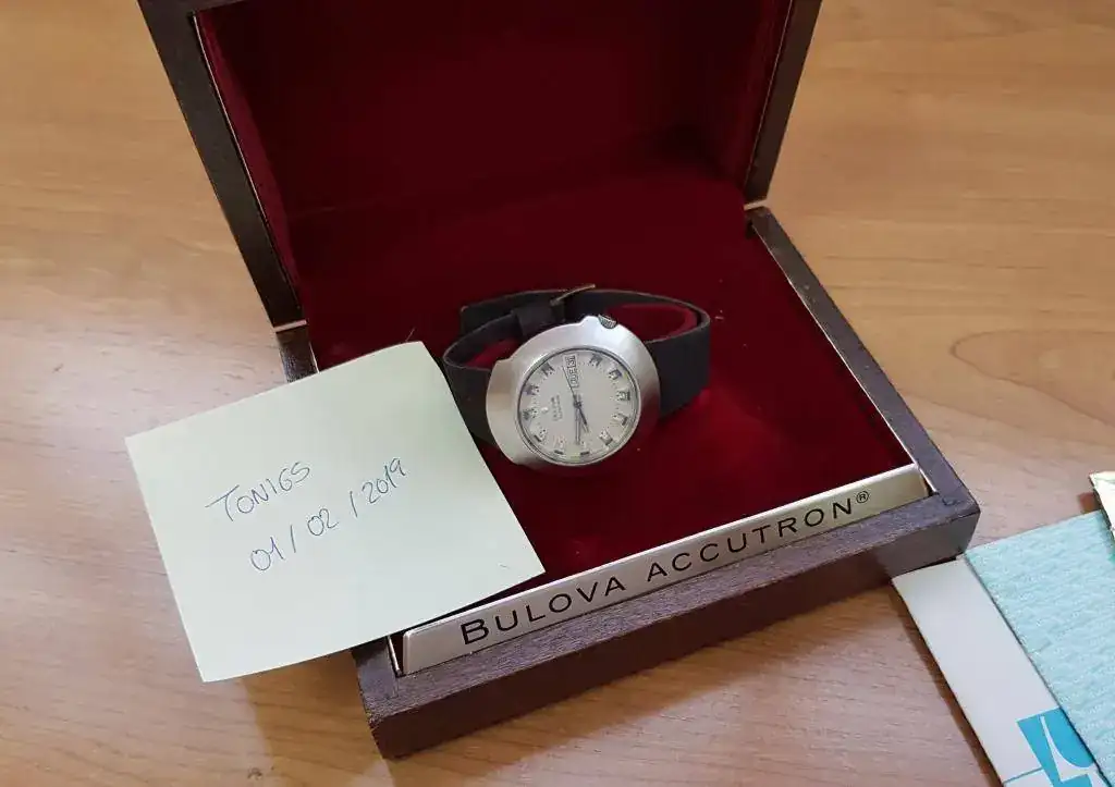 El reloj se encuentra en un estado muy bueno para los años que tiene, con la tapa trasera sin marcas de apertura ni roces, tan sólo con un ligero cepillado de la caja de acero inoxidable. Corona original firmada Bulova. La esfera original, con manecillas e indices en un azul precioso. Mecanismo electrónico Accutron limpio y funcionando. Monta su correa original aterciopelada granate oscuro con algo de uso, como es lógico, pero si pensamos que es la de origen, podemos decir que se encuentra en muy buen estado. La caja de madera se encuentra en buen estado con el interior de terciopelo rojo sin ningún roce, tan sólo se le cayó el logo interior de la tapa y no lo encontré.