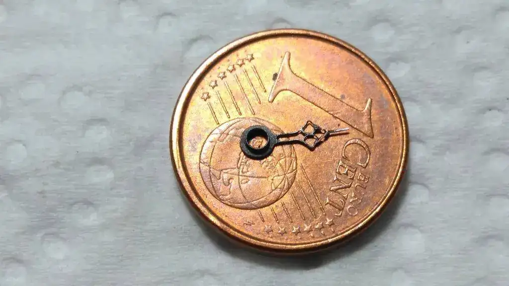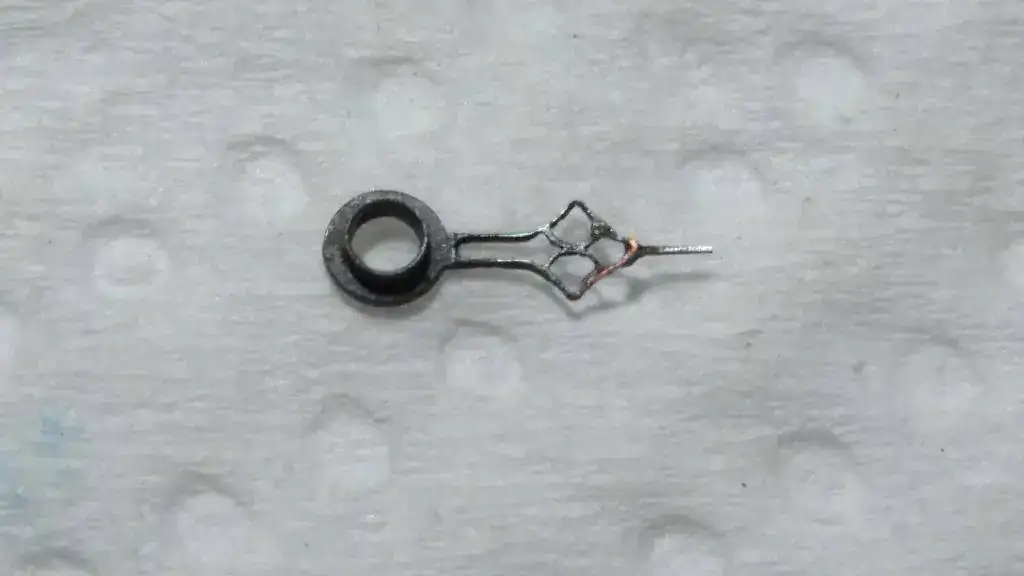El tema de las agujas ha sido algo complicado ya que este modelo llevaba las llamadas de "catedral", algo complicado de conseguir. El caso es que entre los repuestos que tengo había un juego, algo dañado pero que podía ser útil. Las agujas estaban algo oxidadas y aunque trabajé con mucho cuidado con ellas, tras ajustarlas a la máquina, la horaria se rompió. Joer, justo cuando el reloj está acabado.