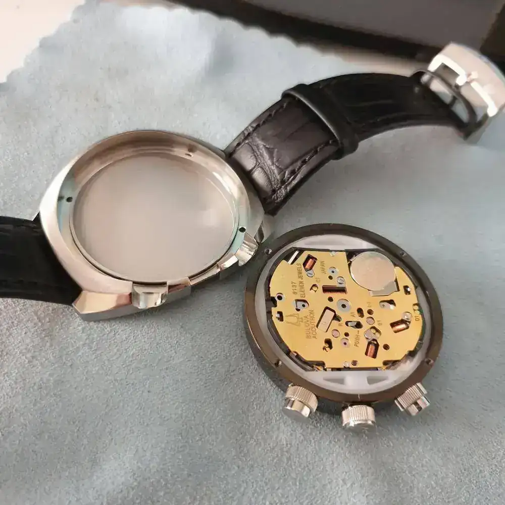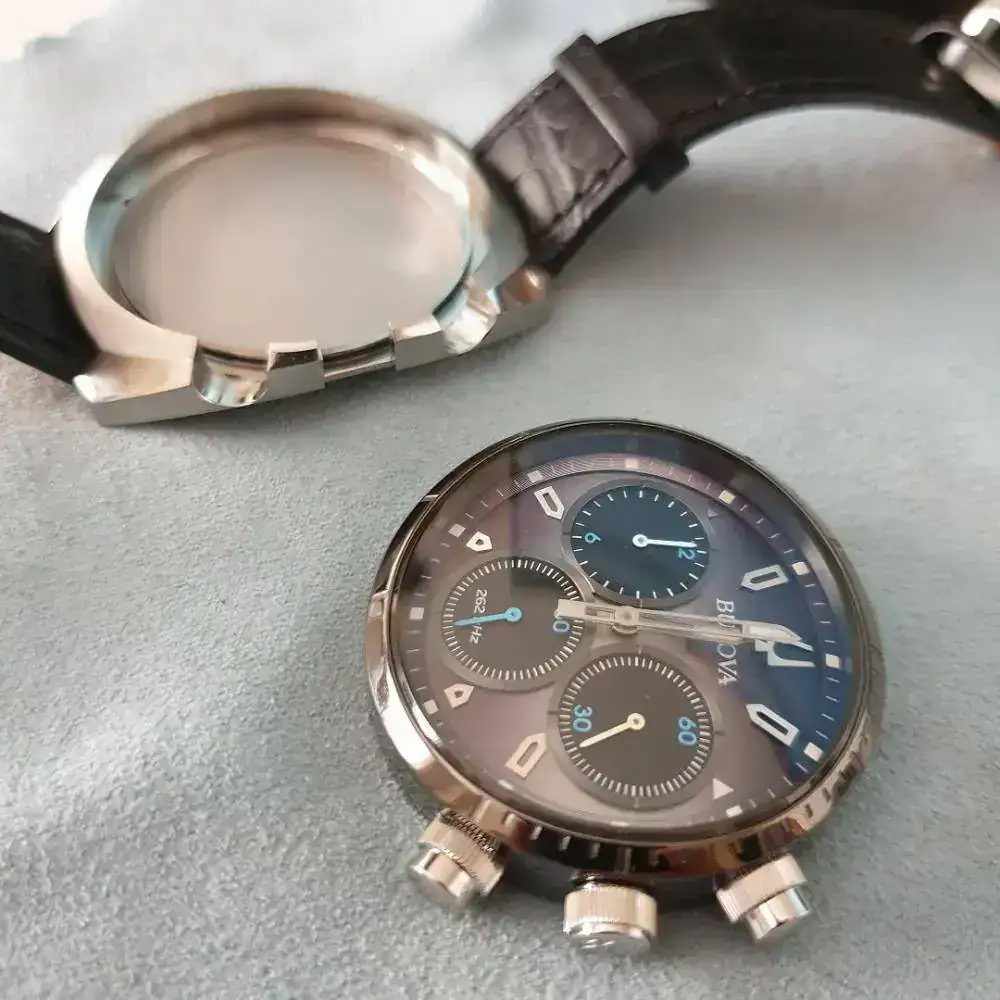 Como dato curioso, no tiene tapa trasera, se tienen que quitar los 4 tornillos y todo el movimiento, incluido cristal y pulsadores, se saca por el otro lado.