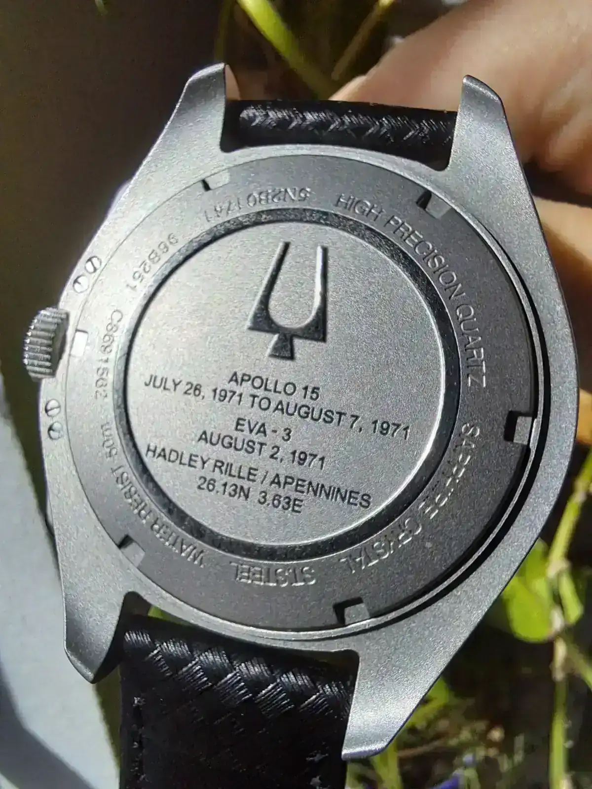 Apollo 15 fue la primera misión de tipo J, más ciencia, mucho más tiempo en superficie y el debut del rover lunar. También fue la misión en la que David Scott terminó usando su cronógrafo Bulova personal durante la tercera EVA después de que el cristal de su Speedmaster se desprendiera.