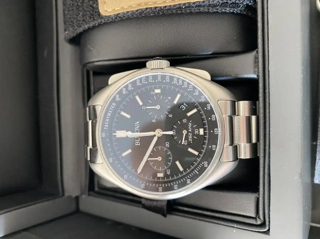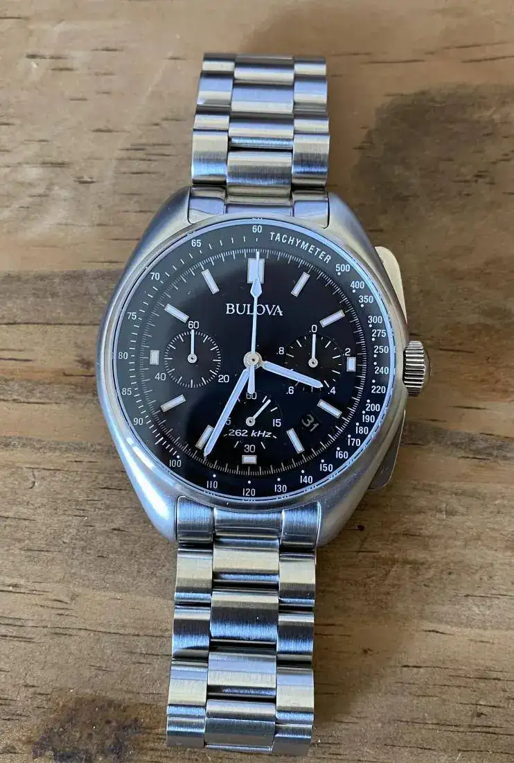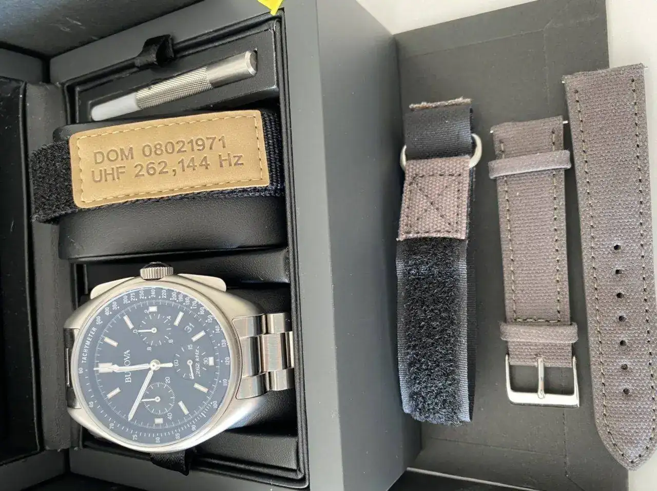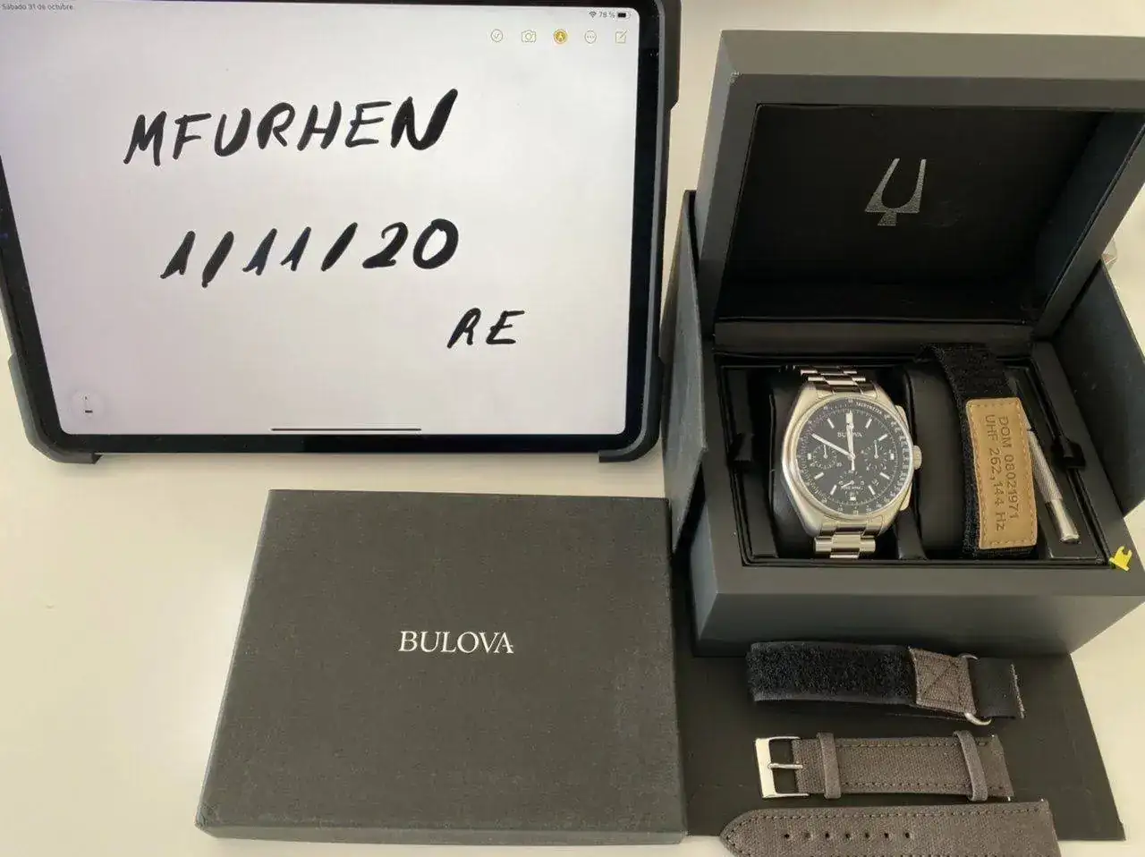 En esta ocasión sacó este archiconocido Bulova Lunar Pilot, una pieza de colección y con mucha historia detrás además de ser una compra maestra para quien lo aprecie, por historia, calidad, precio y estética. El reloj es de marzo de este año, con mucha garantía aún y perfecto funcionamiento. Está como nuevo, sin apenas uso, apenas tendrá 3-4 puestas y varios cambios de correa para ver cómo queda. No tiene golpes o marcas, sólo en la trasera de las asas por el cambio de correa y algún pelillo quizás en el armis, diría que está en un estado de 9,9/10.