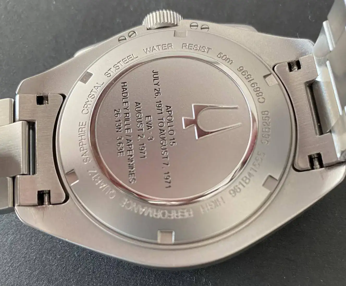 El reloj es una reedición como el que llevaron en la misión del Apolo XV en 1971 y sucesivas, lleva la leyenda en la trasera con los nombres de los astronautas. Monta Cristal de zafiro y movimiento cuarzo de alta precisión, High Performance Quartz, que dota al segundero del cronómetro de movimiento continuo. Además de la estética según parámetros exigidos por la NASA tiene unos originales pulsadores para el cronómetro que lo hacen único y original.