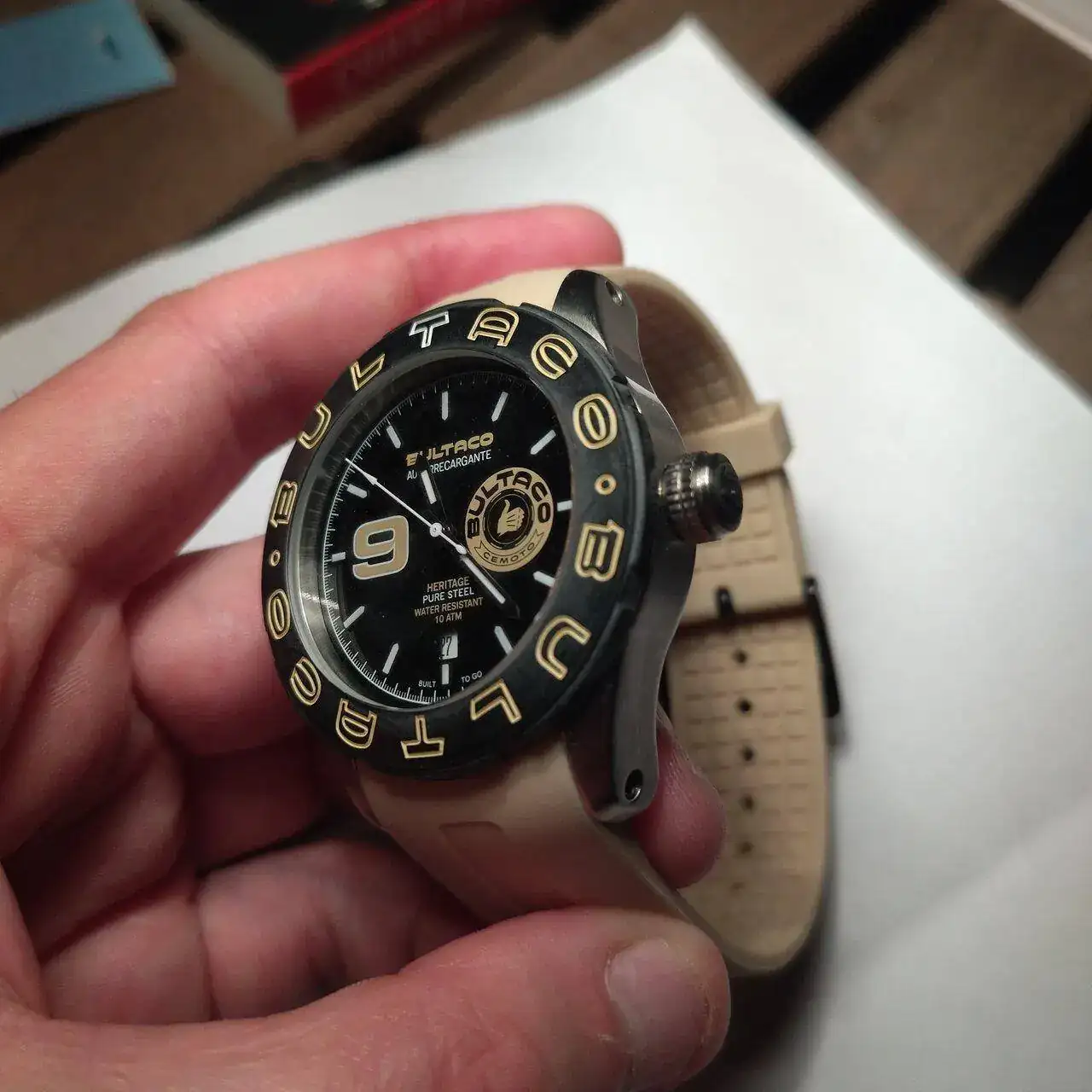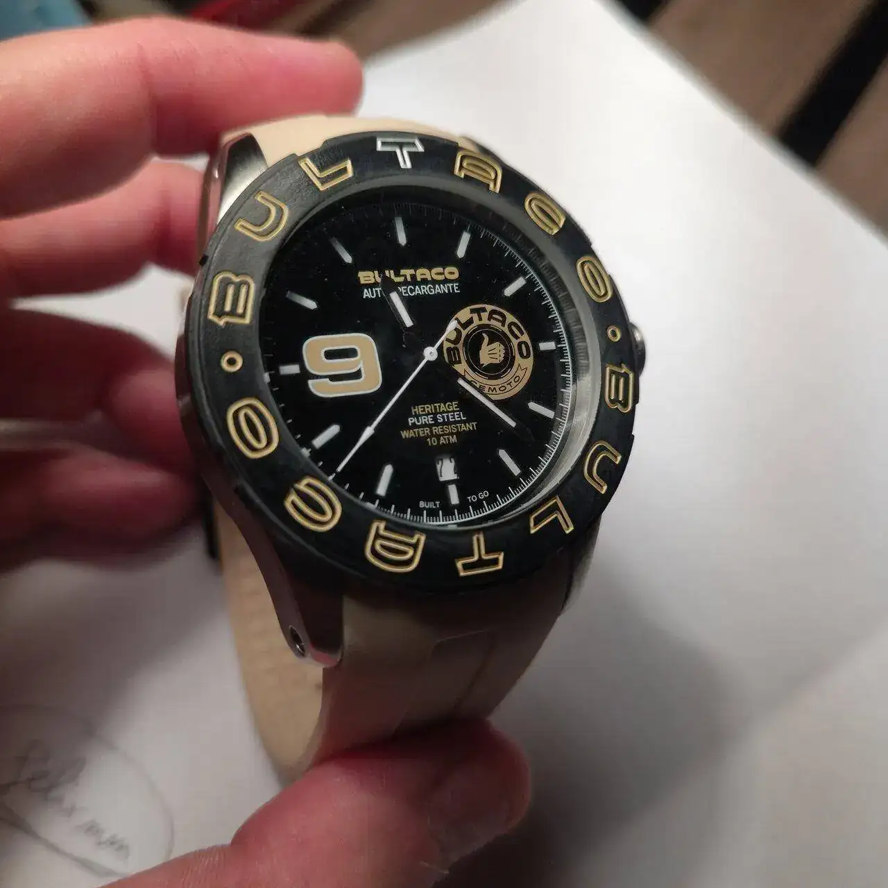 Esfera: Negra, fechador a las 6. Logotipo Bultaco a las 3.