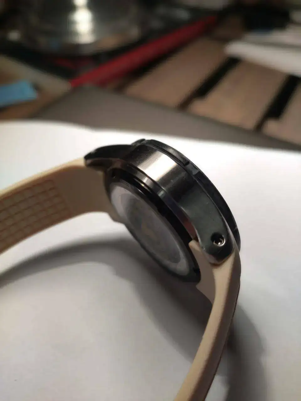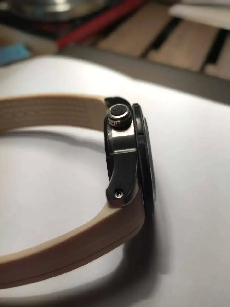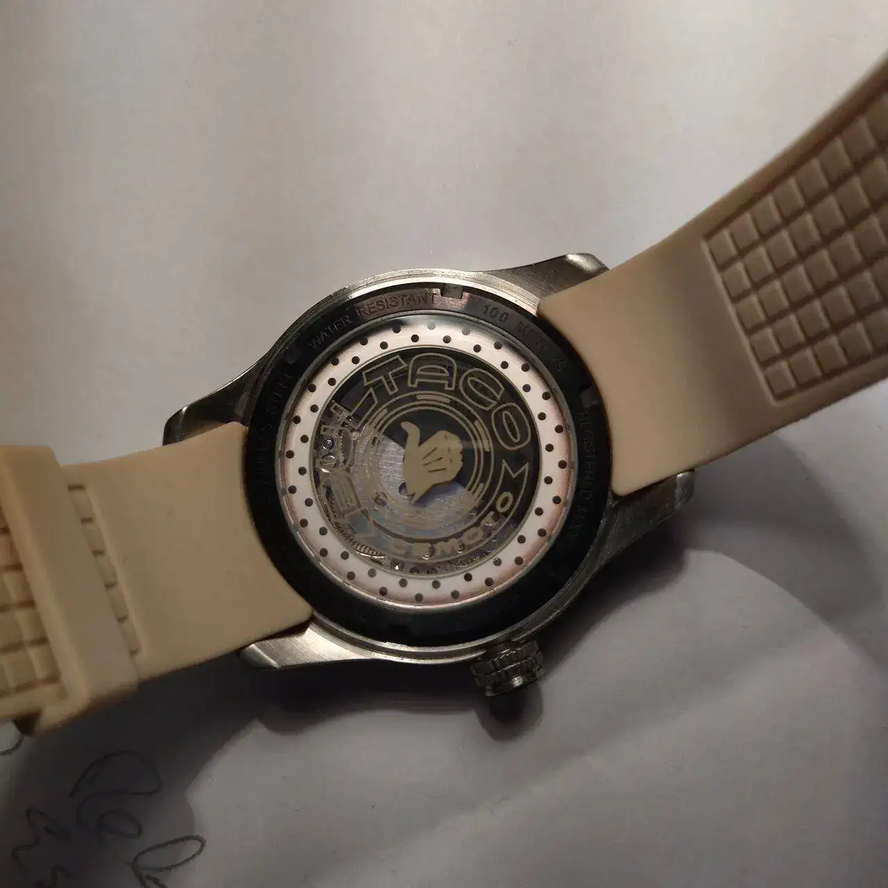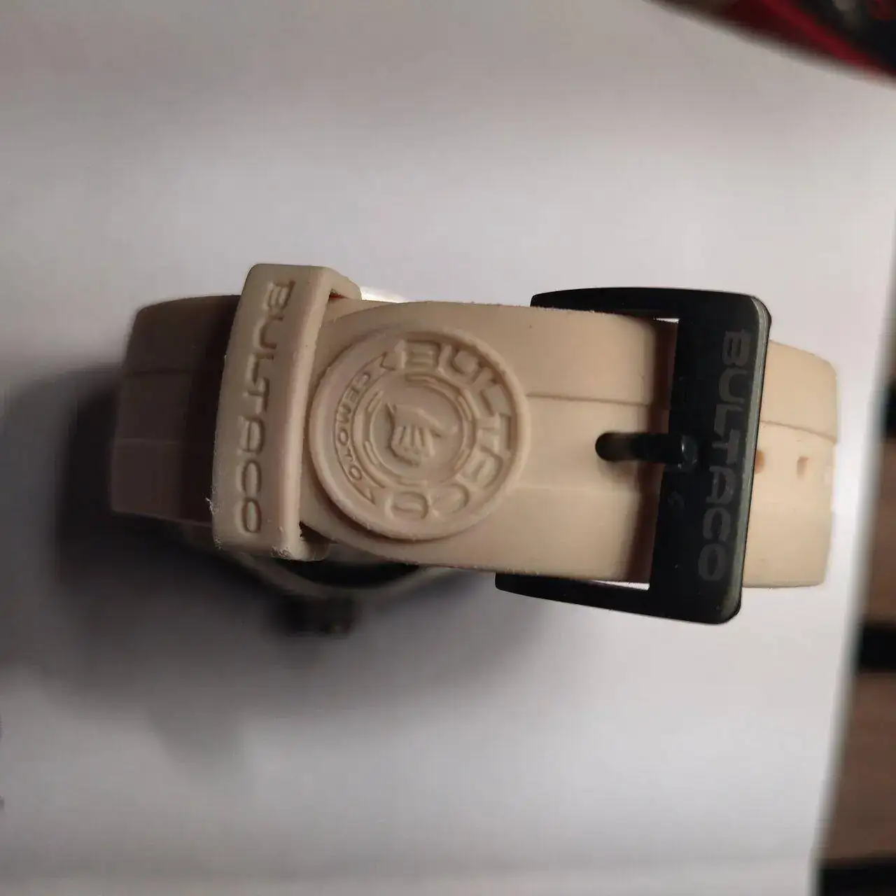 La correa es de goma, en amarillo pálido a juego con las letras del reloj. Va con el logotipo de Bultaco en relieve.