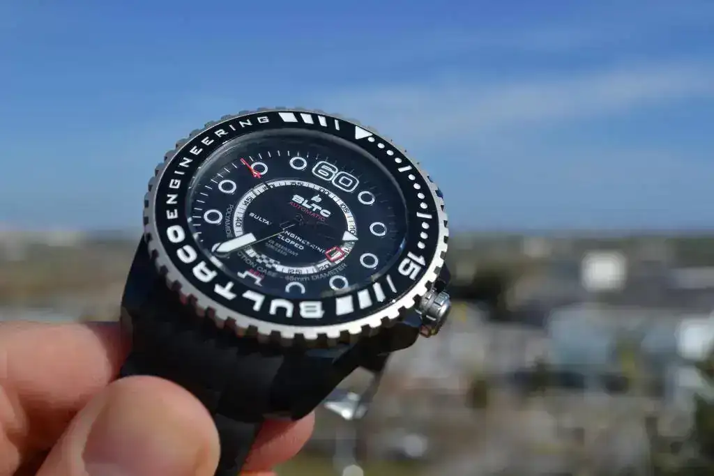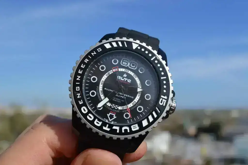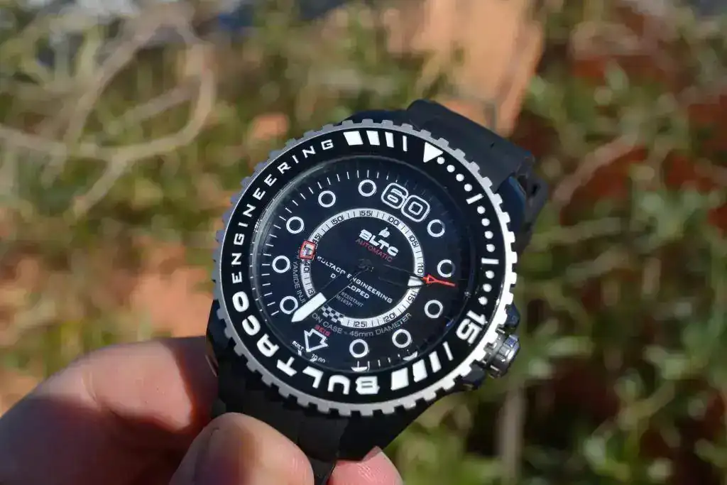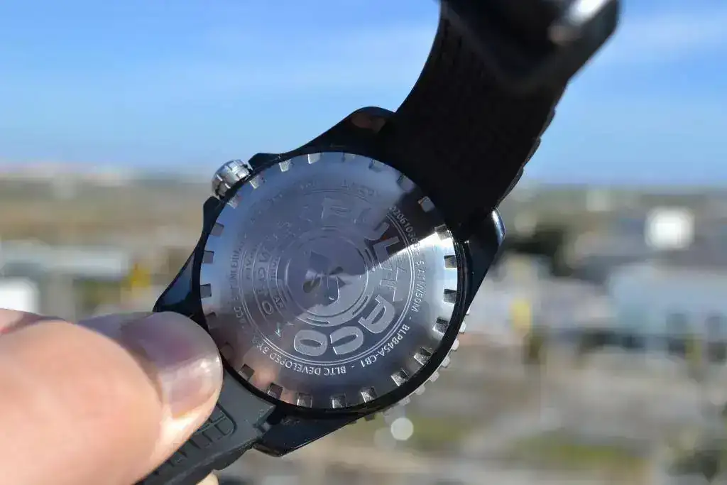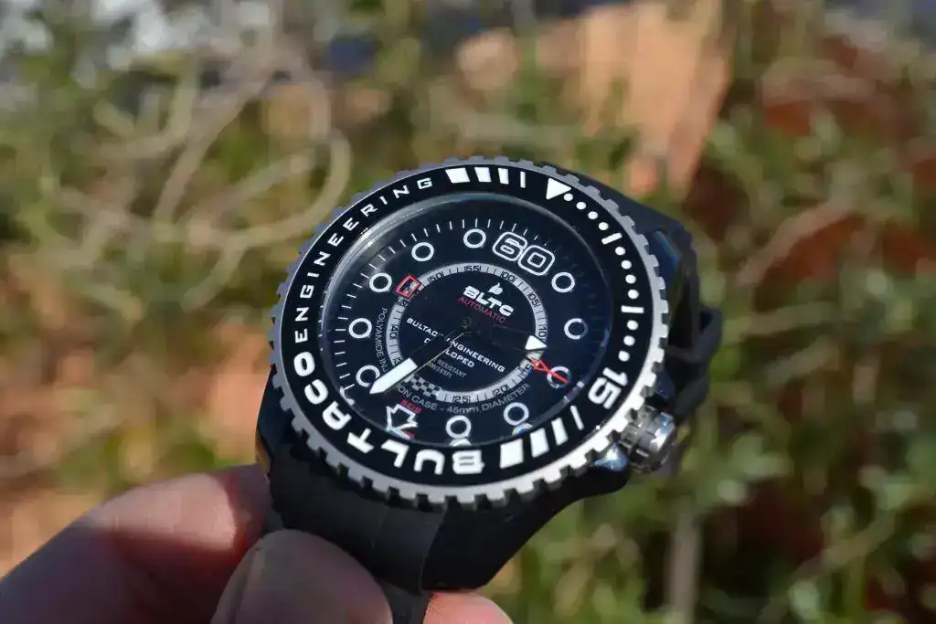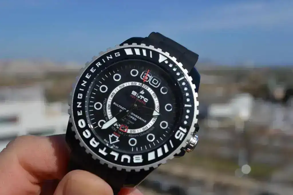 Caja de poliamida negra de 45 mm (con el bisel, 47 mm), calibre automático Miyota sin fechador con carga manual y parada de segundero, correa de silicóna de buena calidad, dotación completa con garantía sellada el 1/9/2013 (aunque creo recordar que me lo dieron un par de semanas antes).