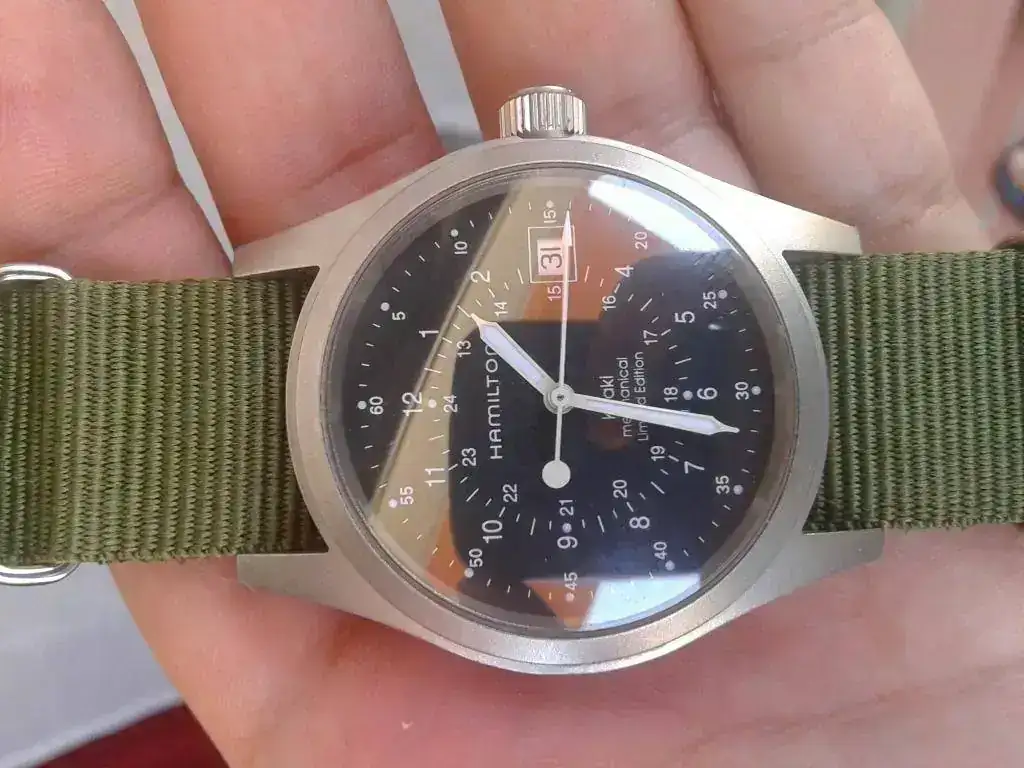 Saco a venta este mítico y buscadisimo Hamilton Khaki edición especial limitada a 3333 unidades, el reloj es de 38mm y de cuerda manual. Su estado es bueno con alguna marca de uso nada grave a mi juicio y una marquita en el zafiro sobre las seis el cual ahi que buscar a conciencia. Al reloj le acompaña la correa de piel original que tiene uso pero aún le queda vida, no trae caja (ira debidamente embalado y acolchado) y los papeles tendría que buscarlos.