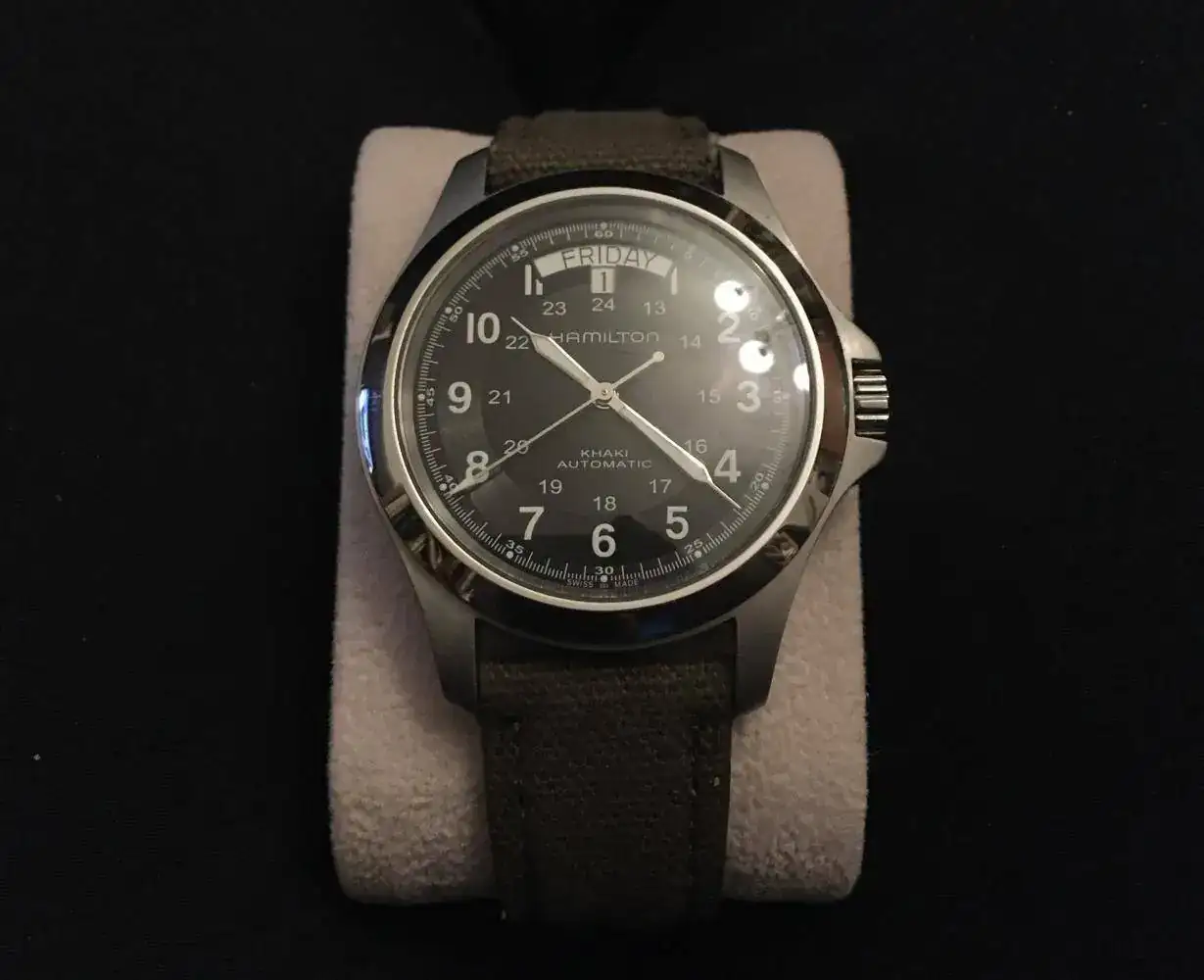 El Khaki King con 40mm es muy versátil y el día completo y fechador le da un punto muy interesante. También es interesante el Khaki field cuerda manual de 38 (que luce más grande) con esfera blanca