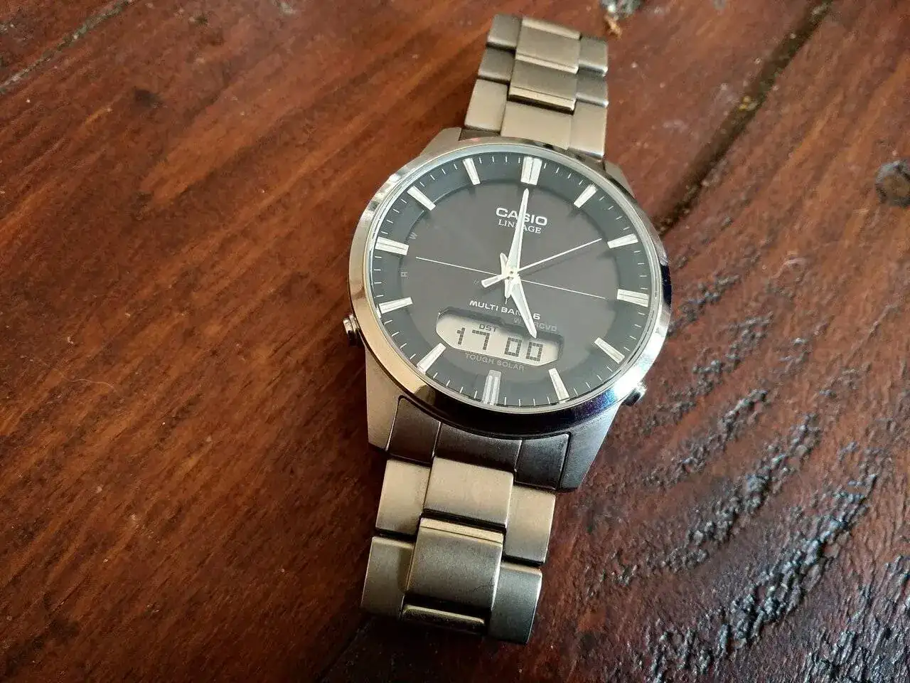 Este mismo modelo lo tengo yo en color negro jajajaja...Dos inconvenientes......que el color negro se le esta perdiendo y que la retroiluminación solo alumbra la esfera, no ilumina la pantalla ledHay muchos, lo más complicado es que te cuadre también lo de "elegante" tengo este que te podría encajar, es un casio lineage de 39, anadigi, radiocontrolado, solar, zafiro, titanio y funciones varias. Ver el archivos adjunto 2681661