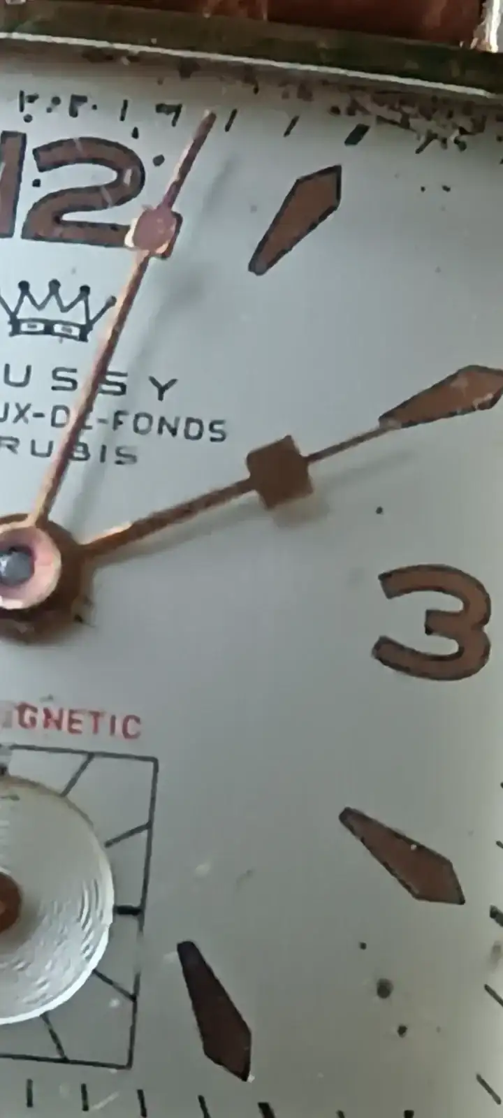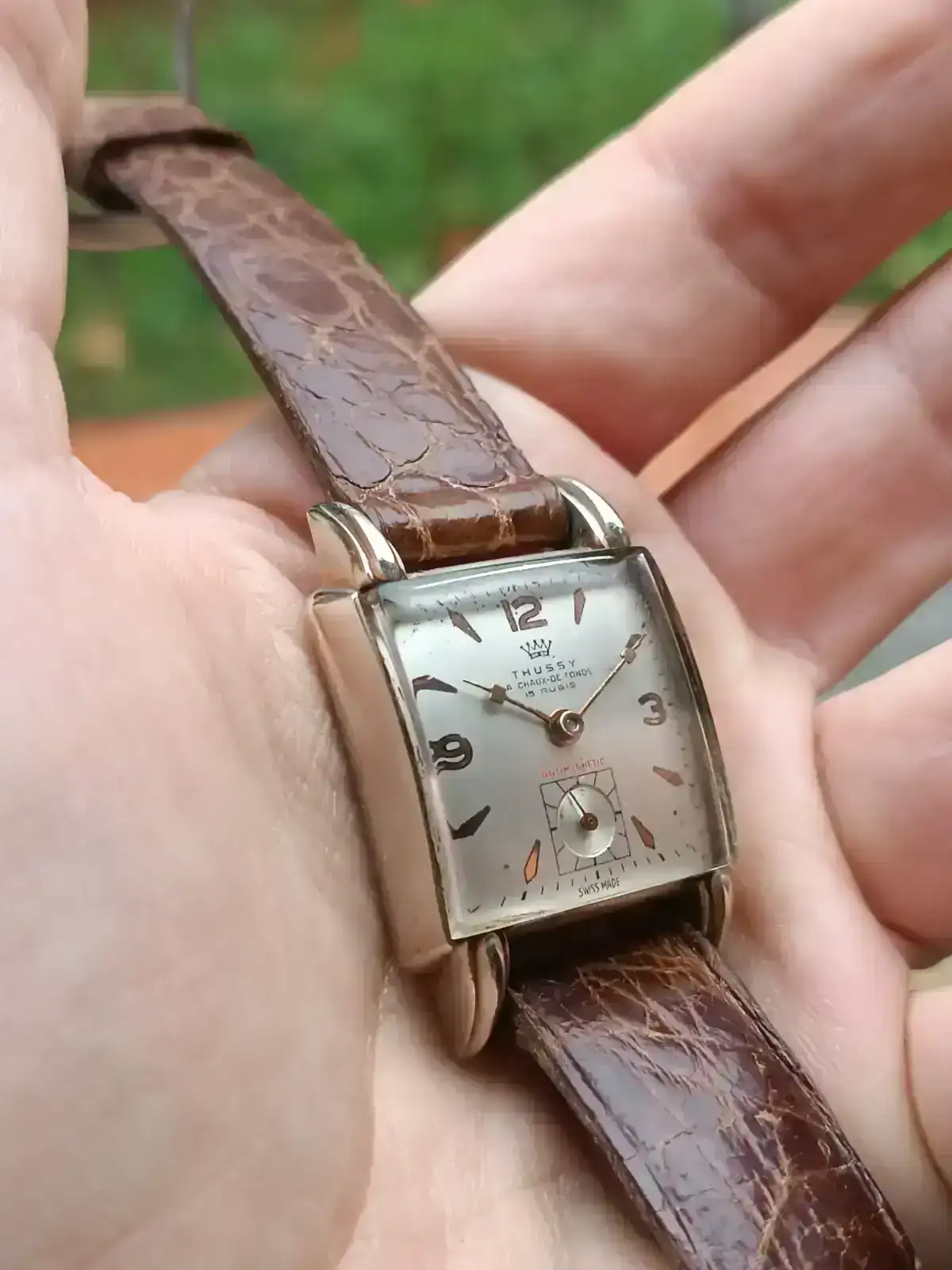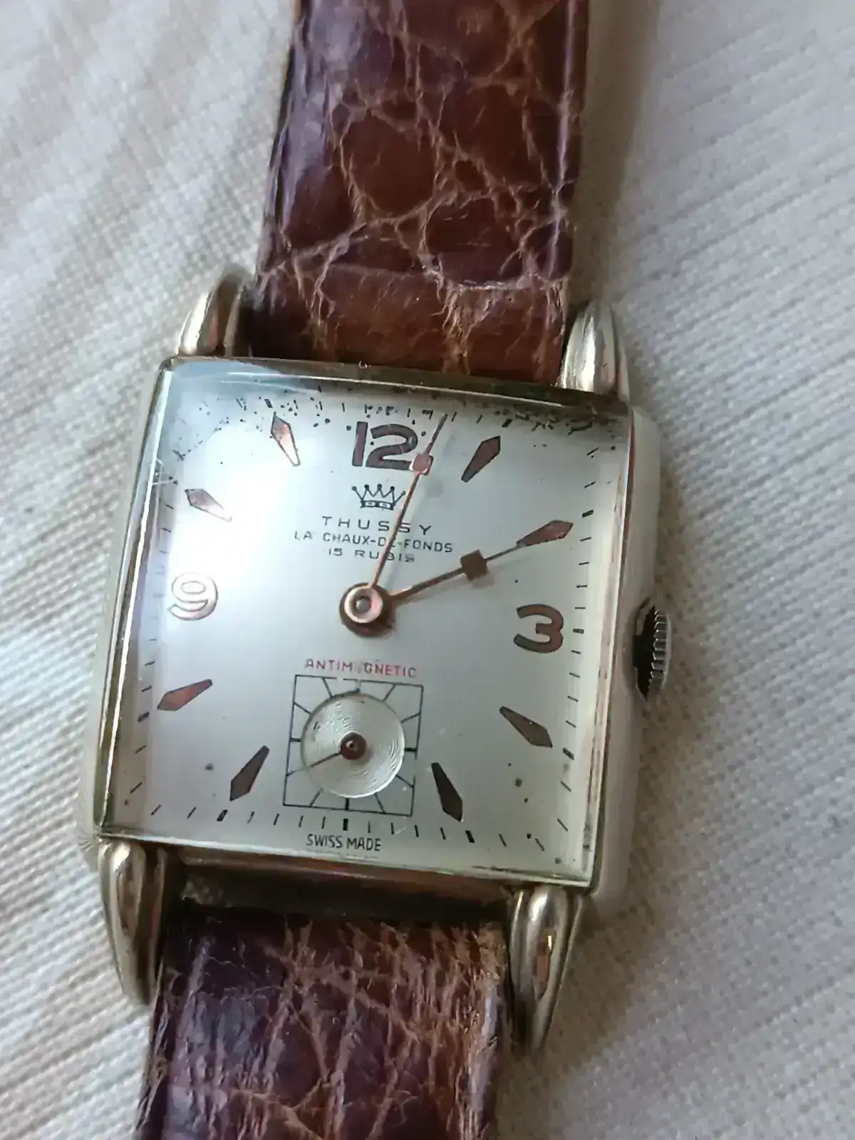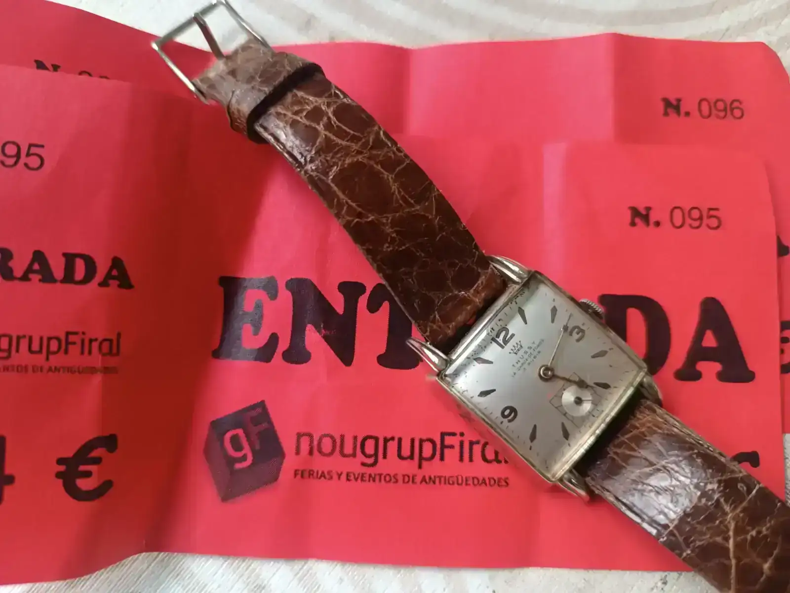 Yo, mientras tanto, no perdía el tiempo. Ya estaba dando cuerda a un bonito Thussy cuadrado. El vendedor me lo rebajó bastante y le dije que me lo pensaría; me fui a dar una vuelta y lo dejé unos quince minutos trabajando. Mientras tanto, me puse a ver algún Longines Cuervo y Sobrinos, cuya esfera no me pareció repintada, pero allí quedó. También un Exactus crono…