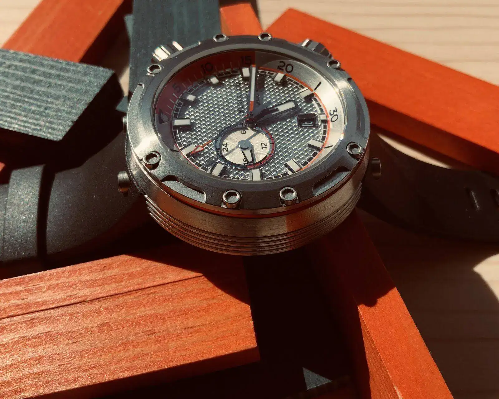 Acostumbrado como estoy a las medidas "vintage" más contenidas, la primera impresión al sacar el reloj de su estuche fue la de estar frente a una bestia parda descomunal (diámetro de 46,6 mm en la base, 16,4 mm de grosor). Por lo que la sorpresa al ponérmelo en la muñeca fue mayúscula, ya que se adapta realmente bien. Considero que contribuye a esta comodidad la forma de la caja, cónica, y el hecho de que esta sea la versión con caucho, que no requiere de extensiones y tiene un buen agarre. No cabecea en absoluto.