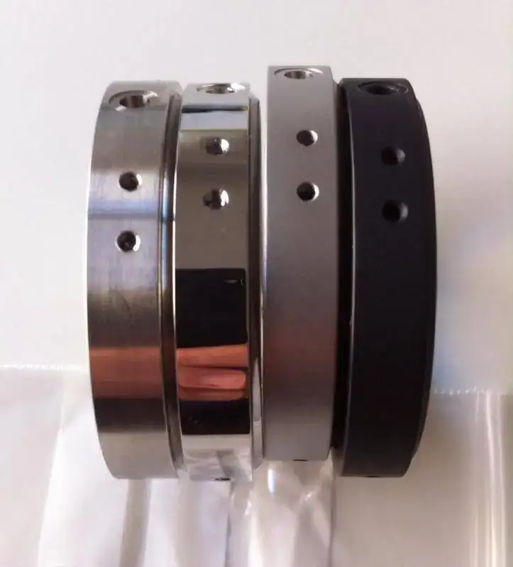 También me gustaría empezar a hablar de los acabados del reloj y del proceso que siguen las piezas. Una vez fabricadas las enviamos a Suiza, tanto para los pulidos/matizados como para los DLC. Os adjunto a continuación los diferentes pasos para llegar al DLC. De izquierda a derecha: carrura de acero tal cual sale del torno, carrura pulido espejo, carrura arenada fina y carrura con DLC.