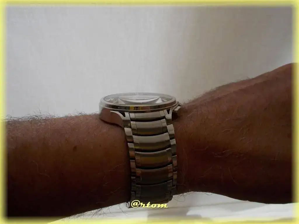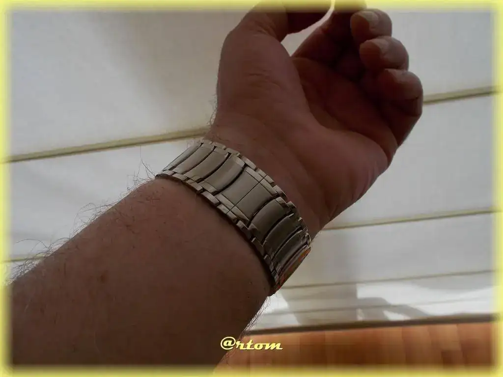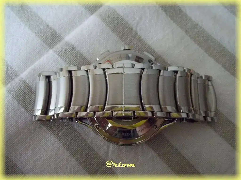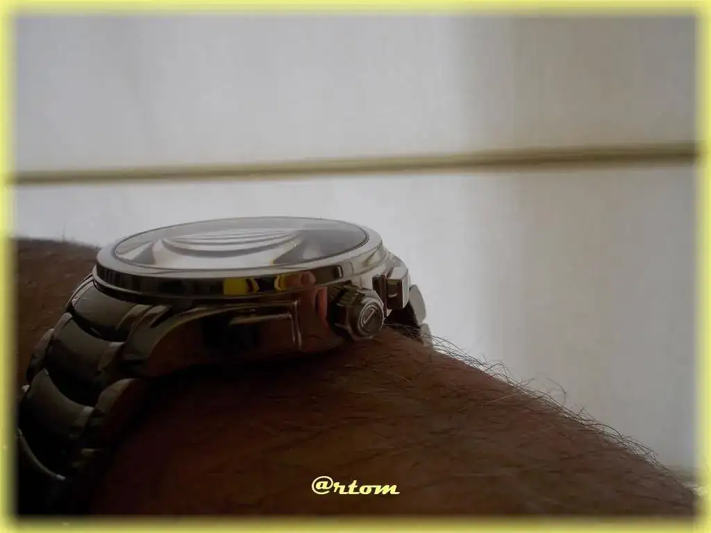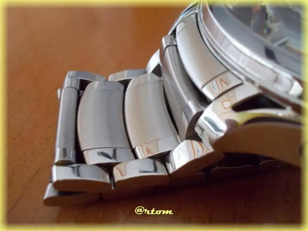 Mención aparte para el brazalete; simplemente excesivo (en todos los sentidos). Sale de las asas con 25 mm y llega al desplegable con 23. Los eslabones están formados por cinco piezas independientes (2+1+2) estando cepillada la central y pulidas las laterales. Es extremadamente cómodo debido a la capacidad de articulación que tiene. El grosor está bien calculado y se queda en 3 mm. Todo con tronillos, nada de pasadores.