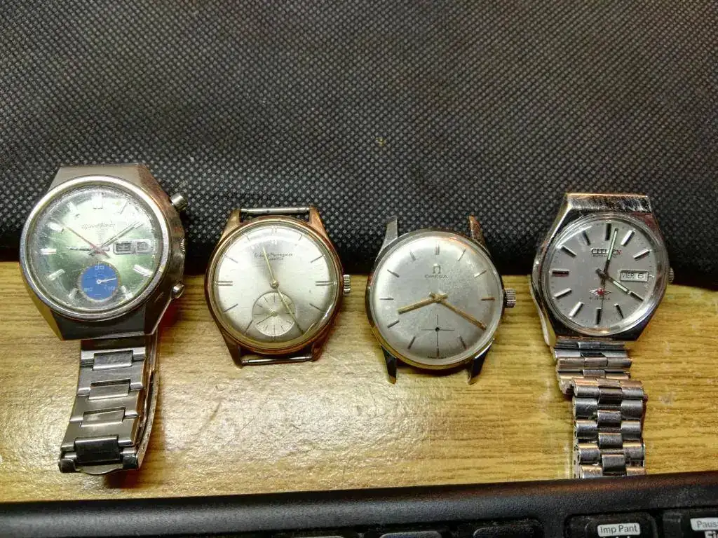 , algunas salvables y otras que ni para fundirlas servían. Entre esas chatarras le pregunto al dueño "tendrá relojes por casualidad?" y tomo una bandeja de plástico y me dijo mientras me la alcanzaba "tengo estos nomas!". Y bueno, acá están todos ellos (son 4) en el estado en que los compré