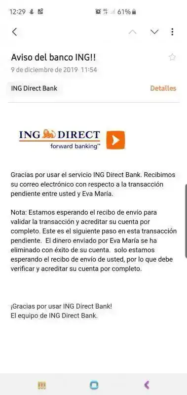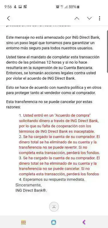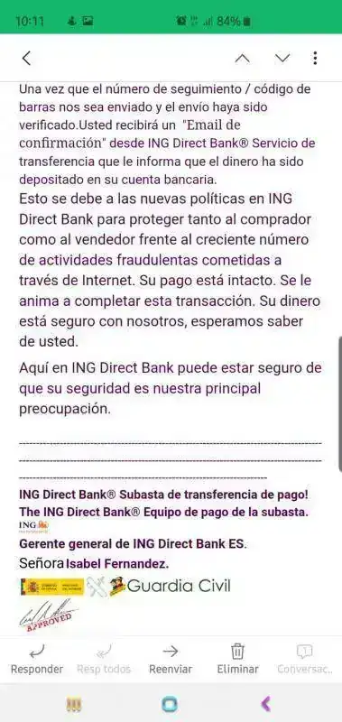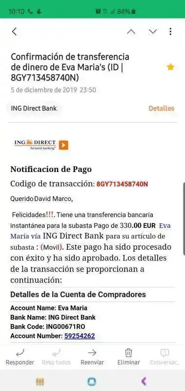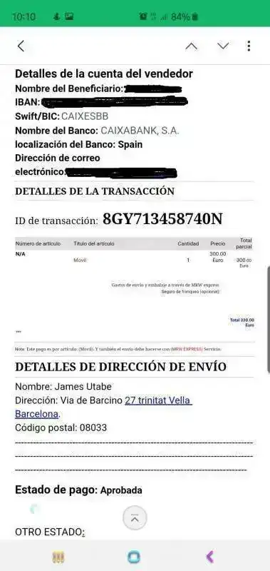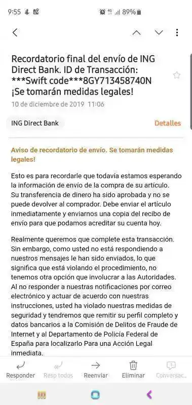Al día siguiente recibes este mensaje: Los datos del vendedor los he tachado, no así los del timador.